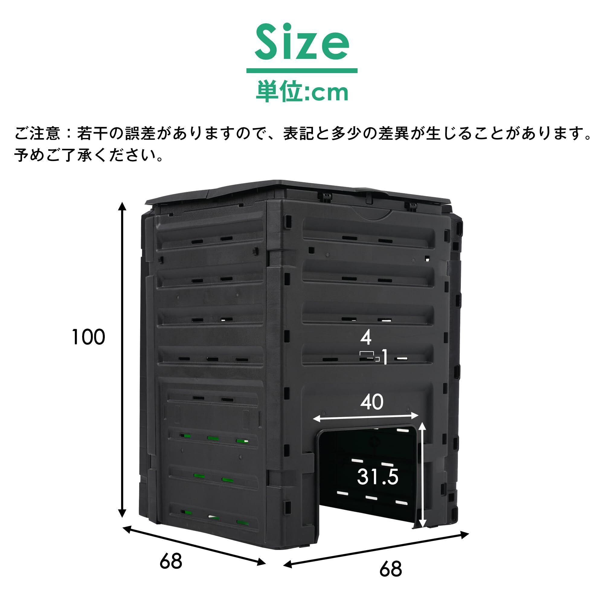【嬉しい大容量】リサイクル素材から作られたプラスチック製です。紫外線による劣化を防ぐ加工が施されていますので、長くご利用いただけます。設置場所は小さな面積でも500リットルの大容量。2点ご購入いただければ、堆肥完熟待ち容器と新しく堆肥作りする容器に使い分けができます。