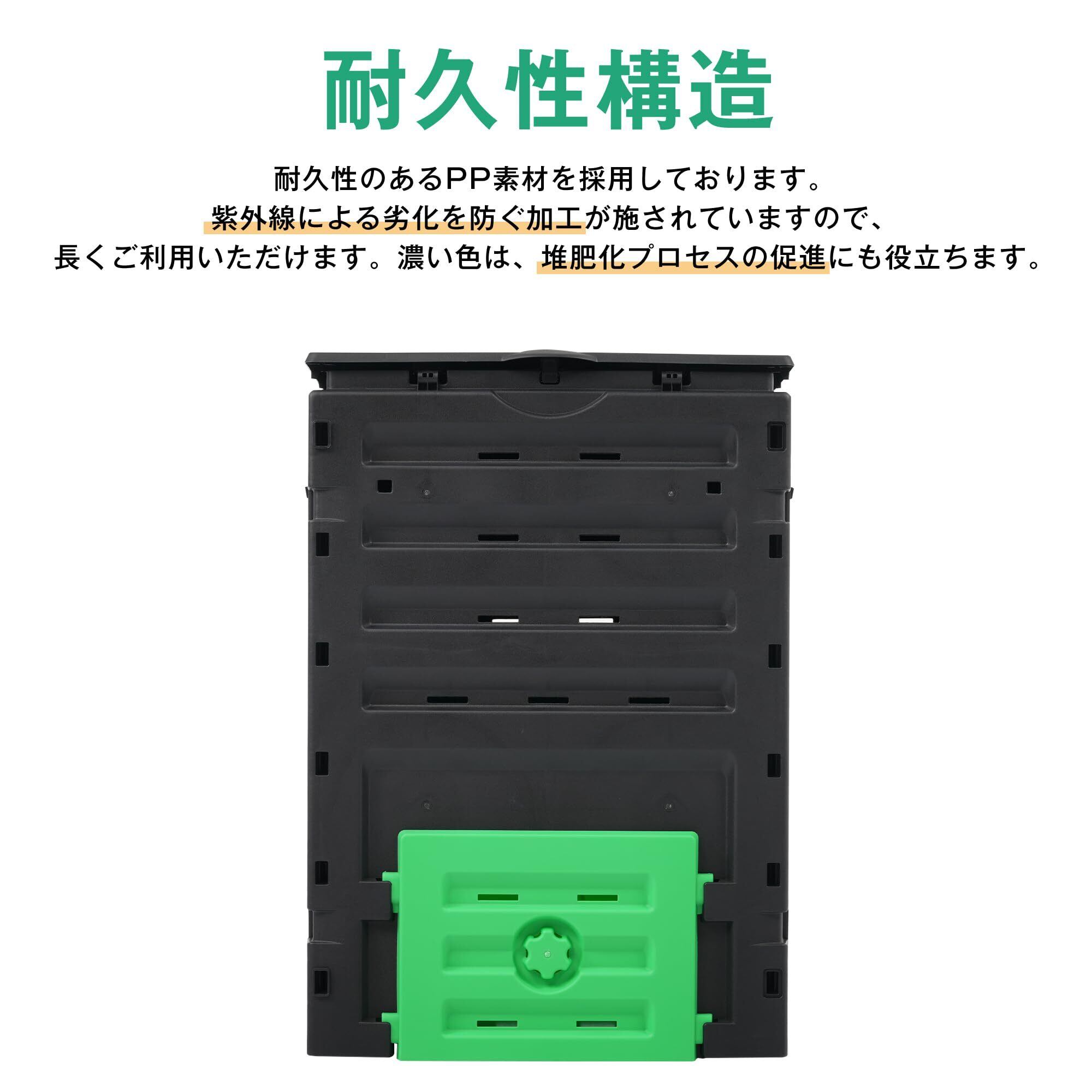 【通気性の良い作り】空気循環が良く、効率的に発酵できます。四方には多数通気口が付いているので、約2〜3ヶ月と比較的早く発酵することが可能です。