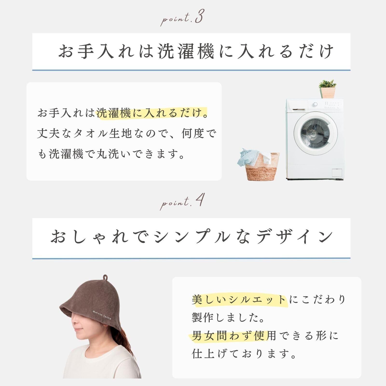 [お手入れは洗濯機に入れるだけ]丈夫なタオル素材を使って製作しているためサウナから帰ってきたらそのまま洗濯機に入れるだけでお手入れ完了です。