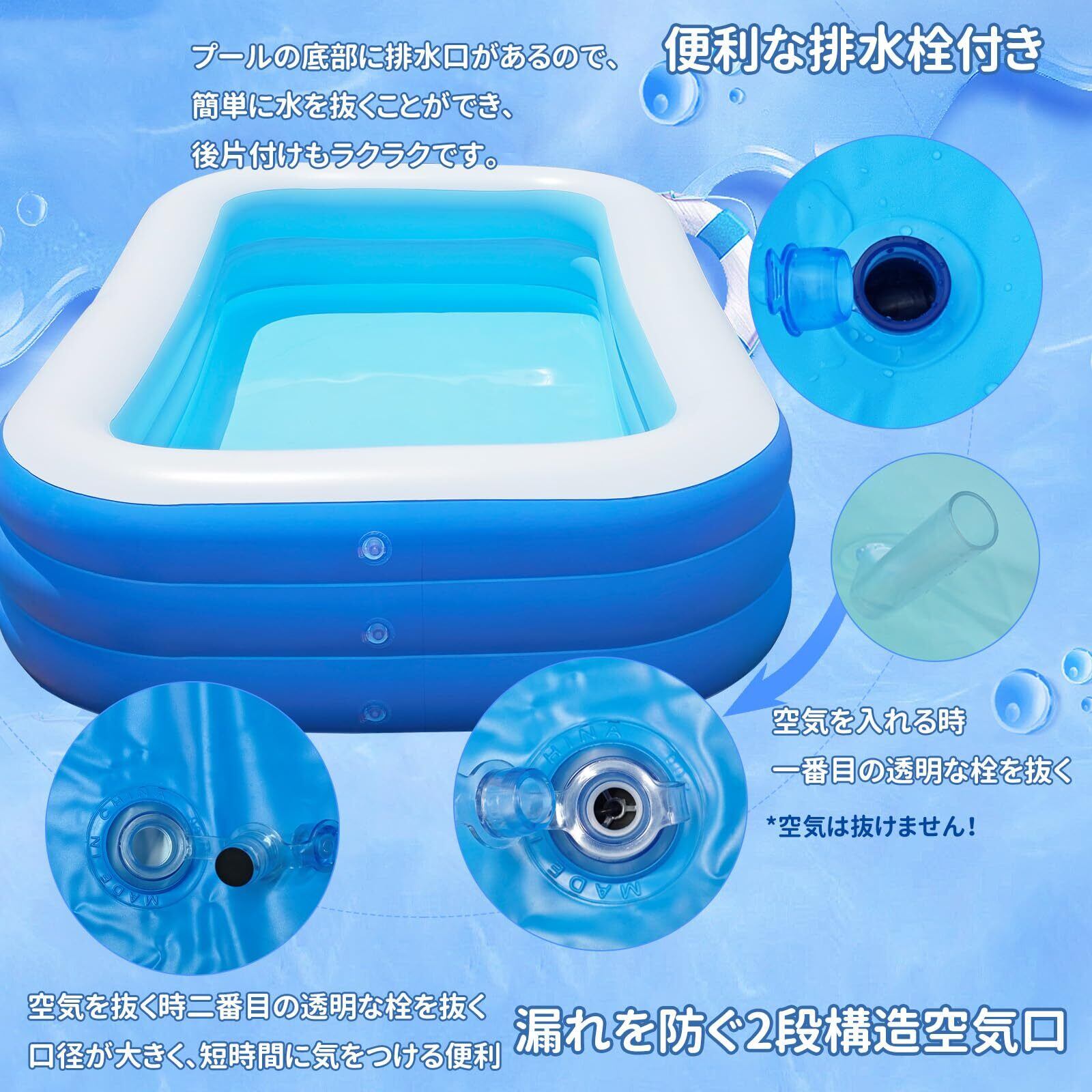 【お使い便利】複雑な組み立て作業は一切なし!空気を入れて膨らませるだけの簡単セットアップです。漏れを防ぐ2段構造空気口であり、空気を入れるまだ空気を抜けるとも簡単にできます。プールの底部に排水口があるので、簡単に水を抜くことができ、後片付けもラクラクです。