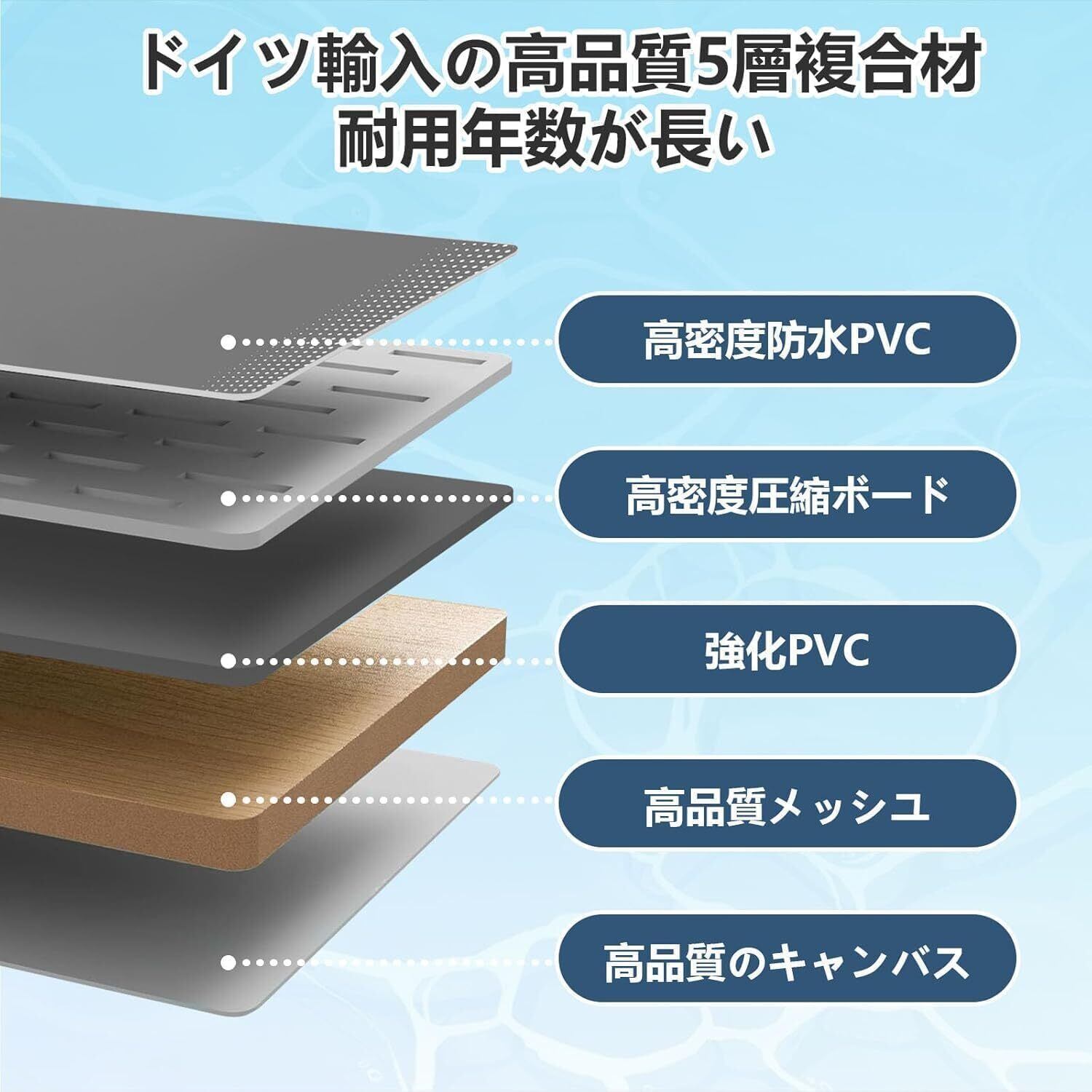 【耐久性試験に合格】引張強度が530PSIに達しています。7mm厚さの5層複合ビニール素材に高品質ポリエステルメッシュを採用しております。業界標準の単層ビニール製プールとは次元が違っています。厳しい材料疲労試験では12,000回以上の繰り返し応力に耐え、市販折りたたみプール素材の3倍の耐久性を確認しました。そのため、季節を問わず永くご使用いただけます。●高品質の厚手素材を採用しているため、やや重くなり、ご注意ください(2.1mタイプ:12.7kg/2.6mタイプ:16.70kg/3mタイプ:18.3kg)。