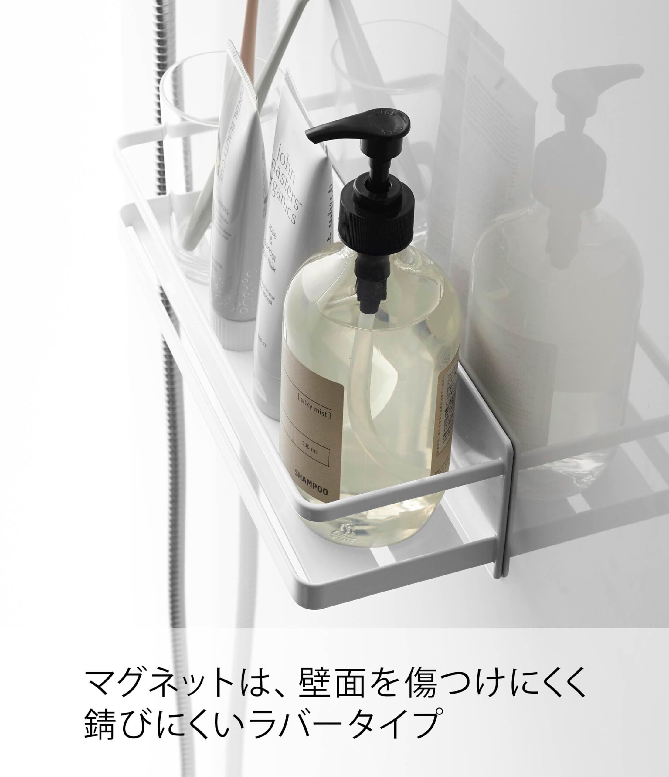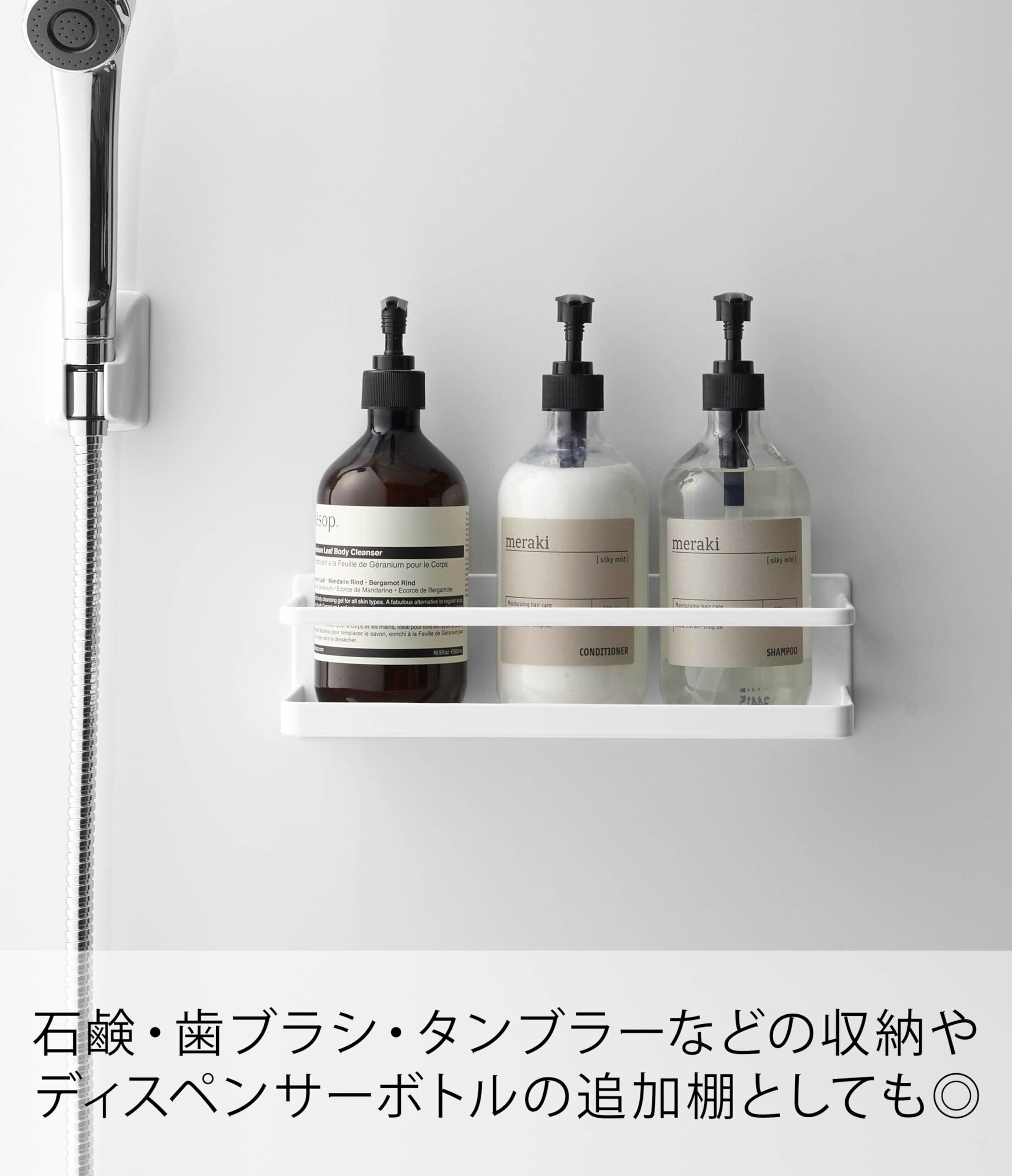 ディスペンサーボトルの追加棚として便利。石鹸・歯ブラシ・タンブラーなどの収納にも。