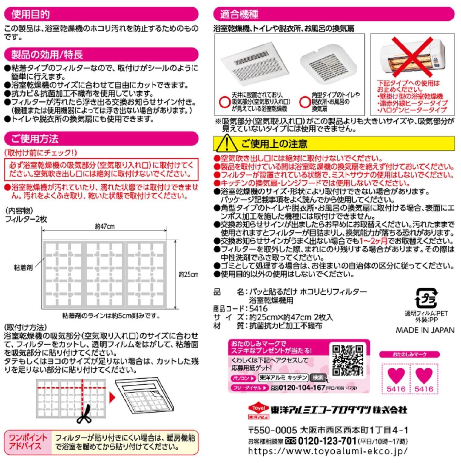 東洋アルミエコープロダクツ パッと貼るだけホコリとりフィルター浴室乾燥機用 2枚 ホワイト 170mm×20mm×190mm