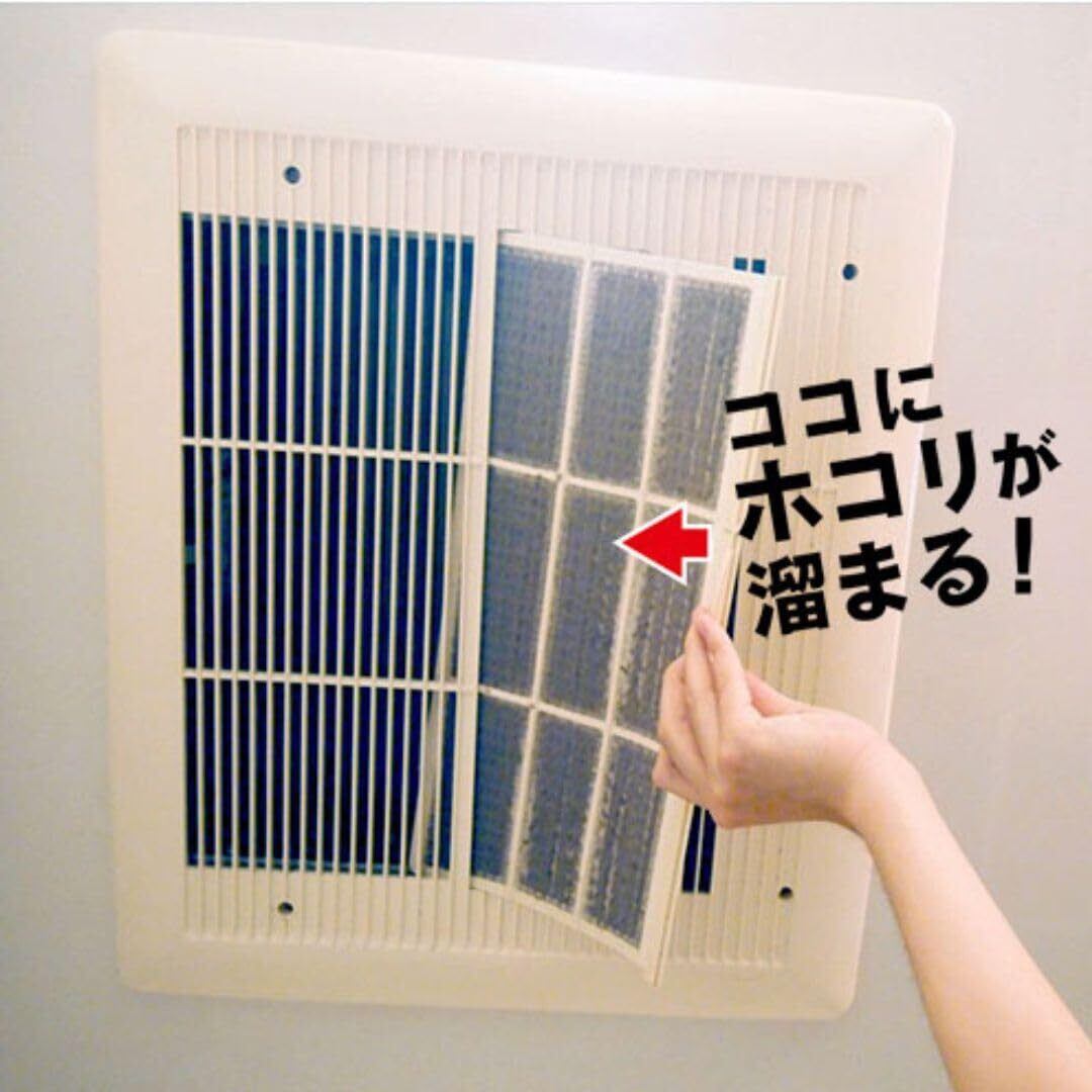 粘着タイプでシールみたいに簡単取り付け。浴室乾燥機の吸気部分にたまるホコリ汚れを防止するフィルターです。