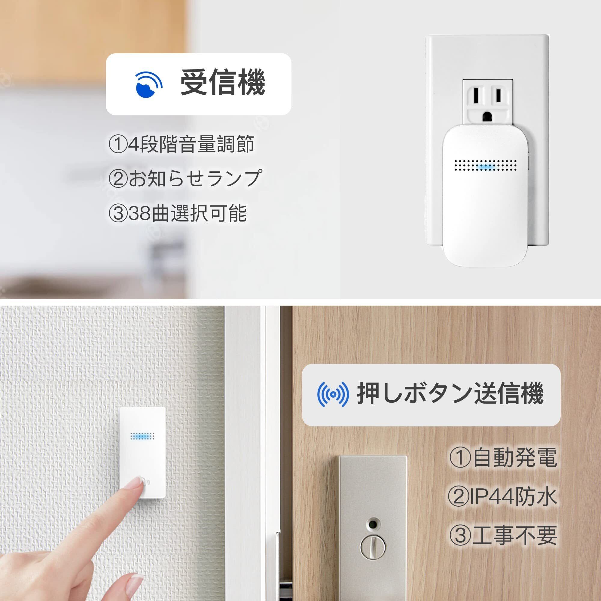 【38曲4段階音量調節と光でお知らせ】このワイヤレスチャイムの送信機を押すと、受信機が音を立てながら両方のライトが点滅してお知らせします。 この玄関チャイムは38種類の音色の曲と0-100DBの4段音量を選ぶことができます。自分の好みや使う場所に合わせて、適切な音量を選ぶことができて、とても便利です。