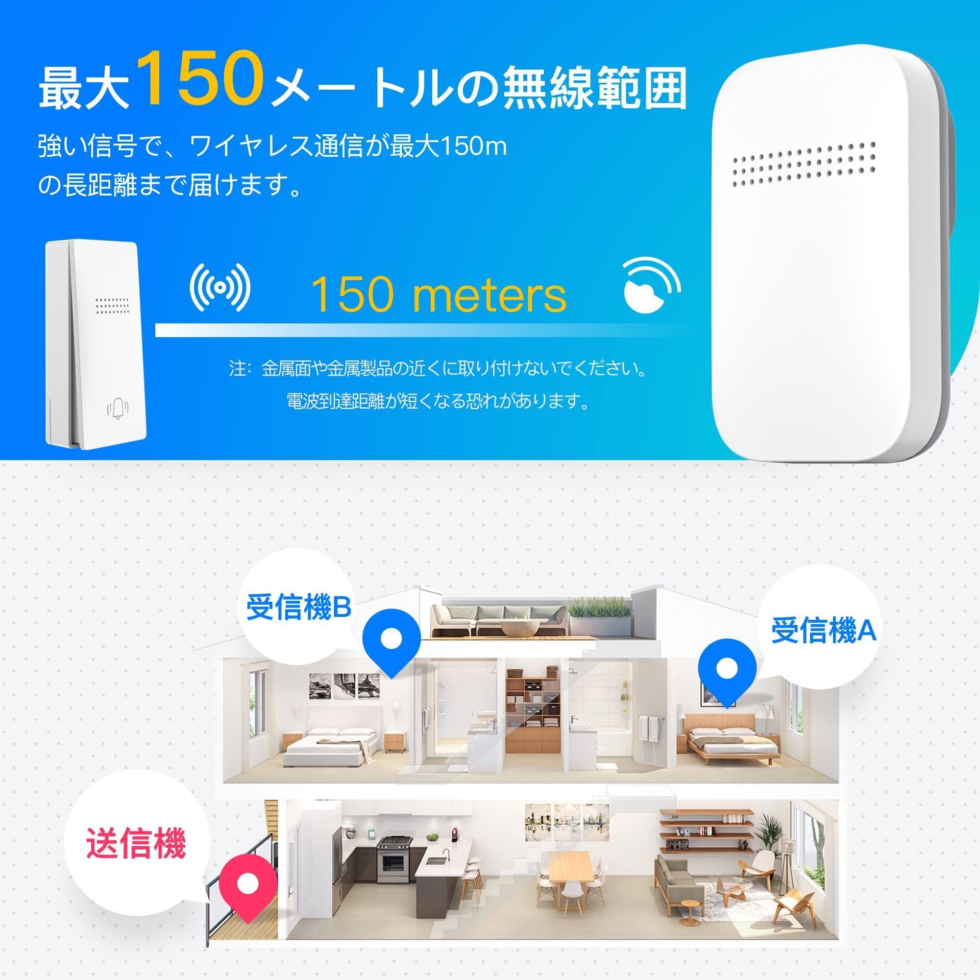 【安定受信&記憶機能】このドアチャイムは高感度の受信機を採用して、壁を通して安定的に受信することができます。屋内での使用はもちろん、2階建てでの使用も可能です。 曲を記録できるメモリー機能付き、場所を変えて使うときは繰り返し作業をしなくて使いやすいです。