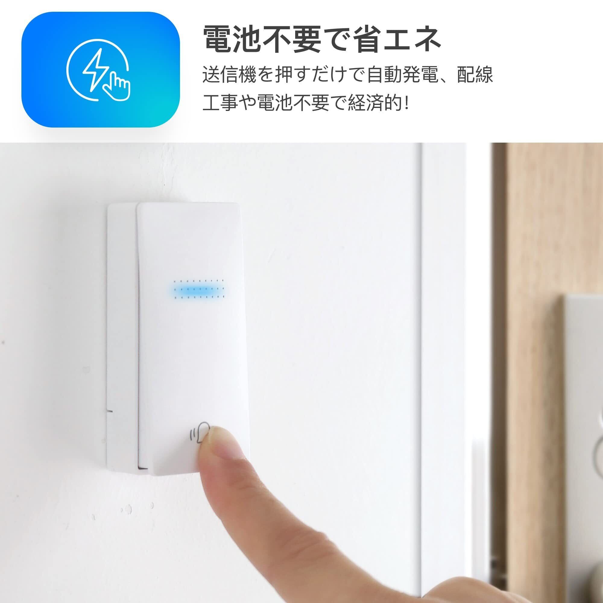 【電池不要&簡単取付】自動発電の送信機なので電池不要で、ボタンが押されたときのみ電力を生成します。このため、メンテナンスやの頻度が低く、長い寿命を持つことができます。 また両面テープとネジが付属しており、配線不要で簡単に取り付けることができます。 受信機はコンセントに差し込むだけ、お子供や年寄りの方がご利用できます。