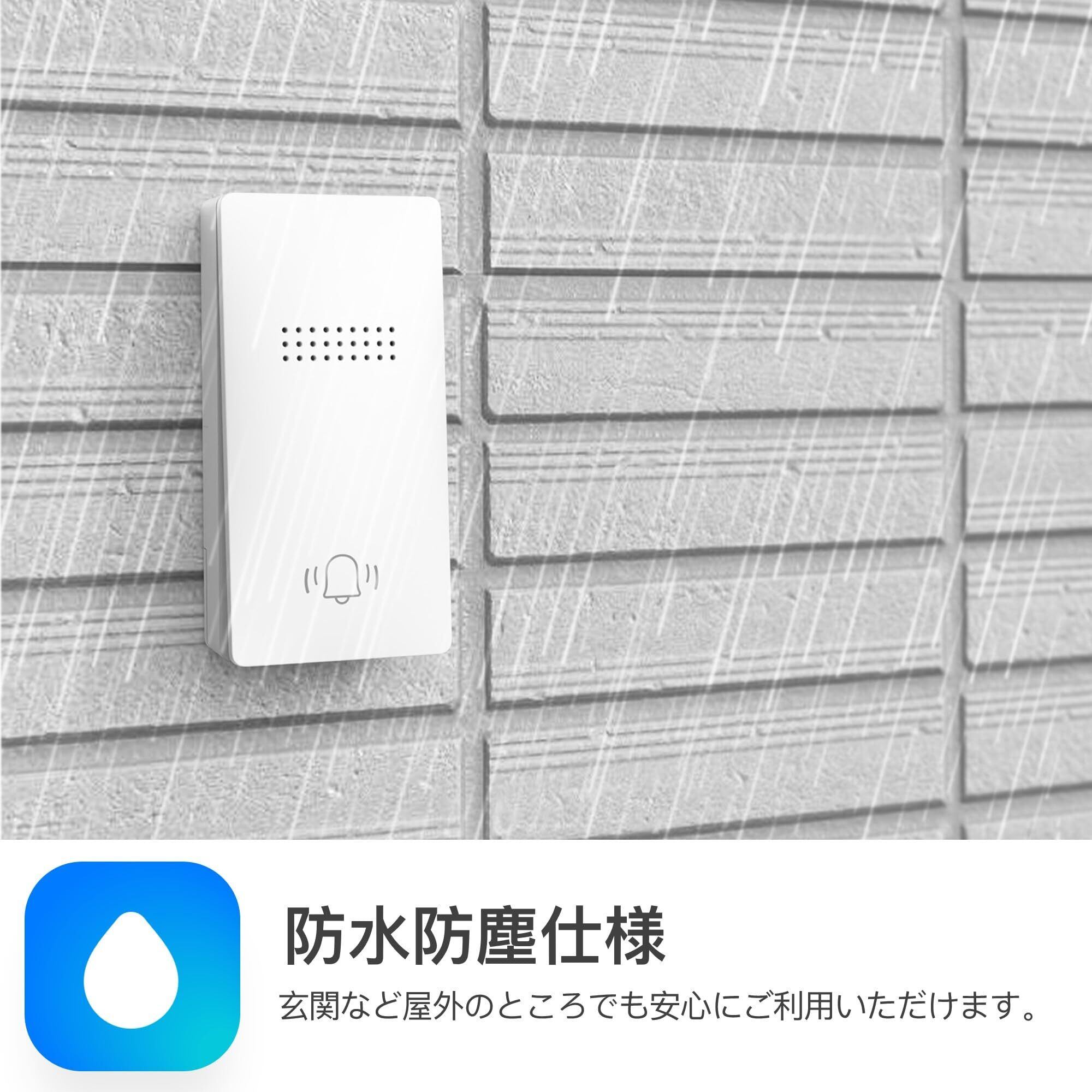 【耐水防塵仕様】この玄関チャイムの送信機はの耐水防塵内部構造を採用しており、屋外や浴室など水がかかる場所で使用しても大丈夫です。雨や水しぶきが直接的にドアベルにかかっても、内部の回路や部品が損傷することなく正常に機能します。これにより、長期間にわたって信頼性のある通知装置として使用できます。