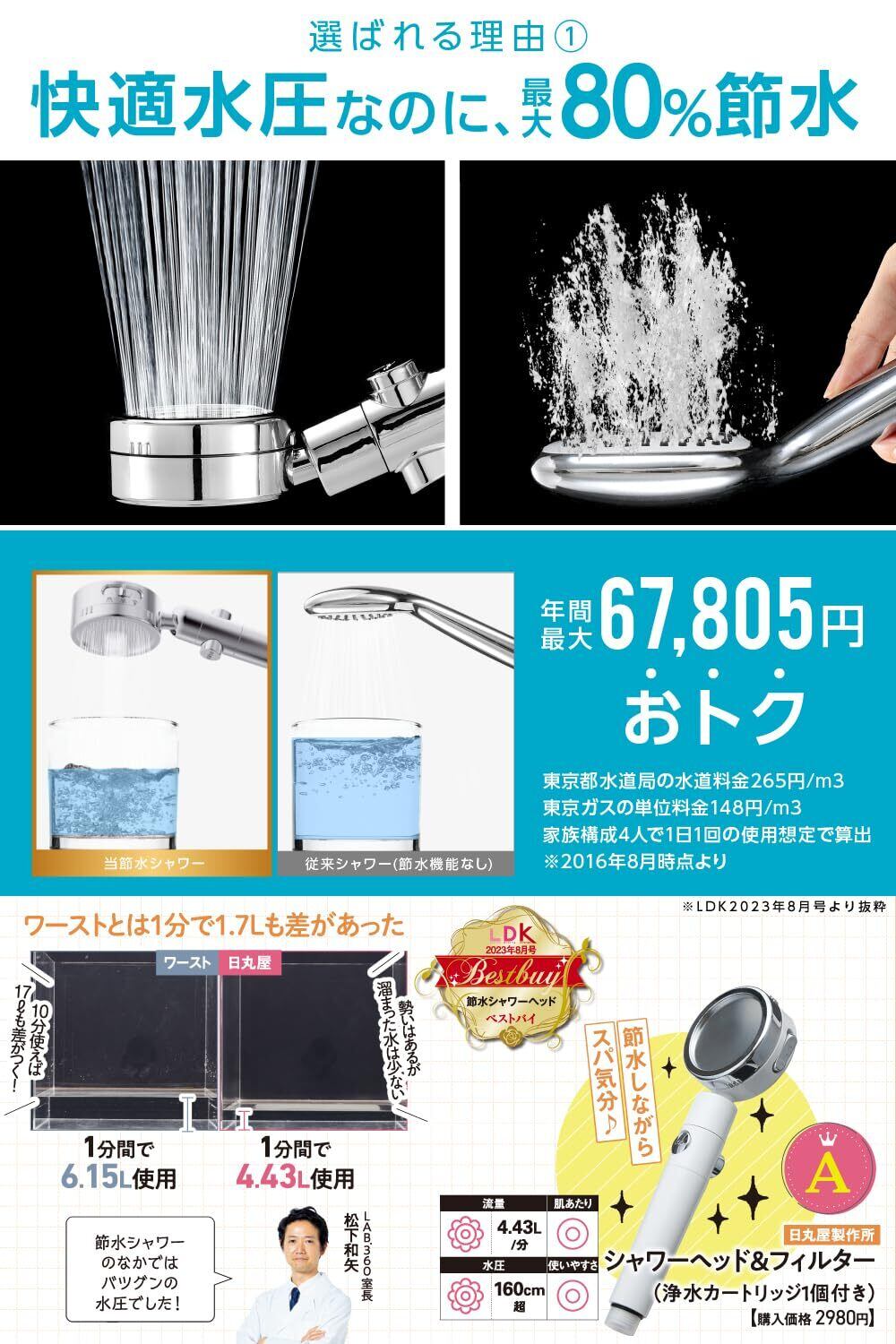 【LDKベストバイ3冠受賞】日丸屋製作所 シャワーヘッド 日本製塩素除去剤 節水 浄水 止水ボタン 水流調整 角度調整 アダプター付 国際基準G1/2 (シルバー)