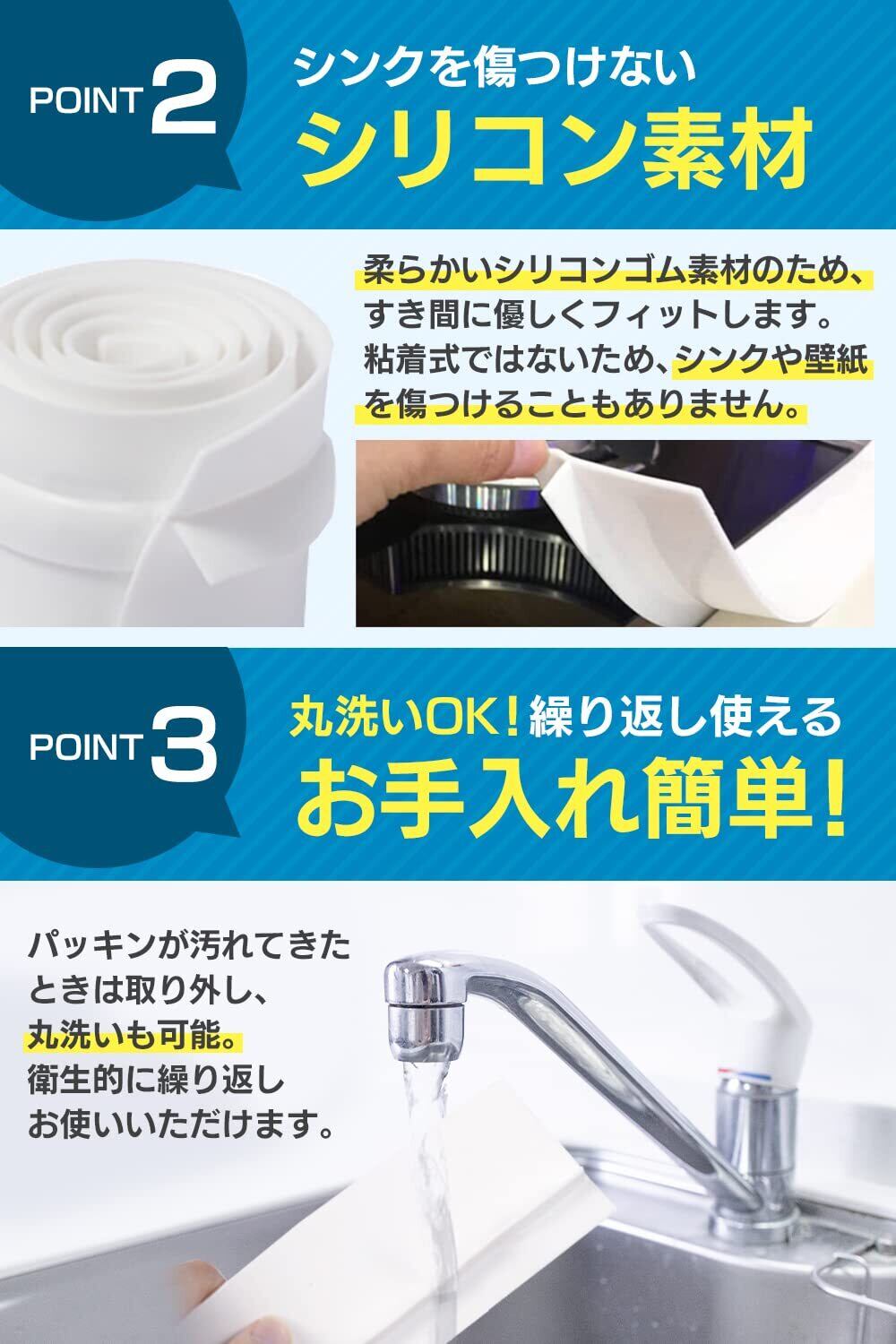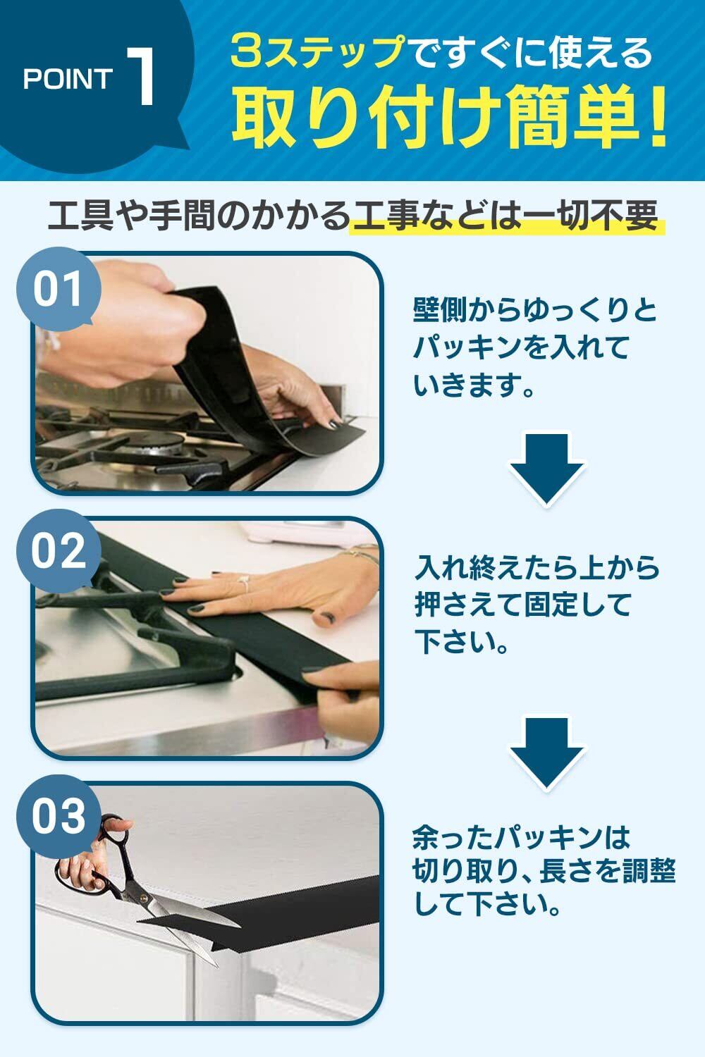 【取り付け簡単】工具や接着剤は使わずに簡単に取り付けることができます。粘着性ではないため、シンクや壁紙を傷つけることもありません。(2mm~20mmのすき間に対応)