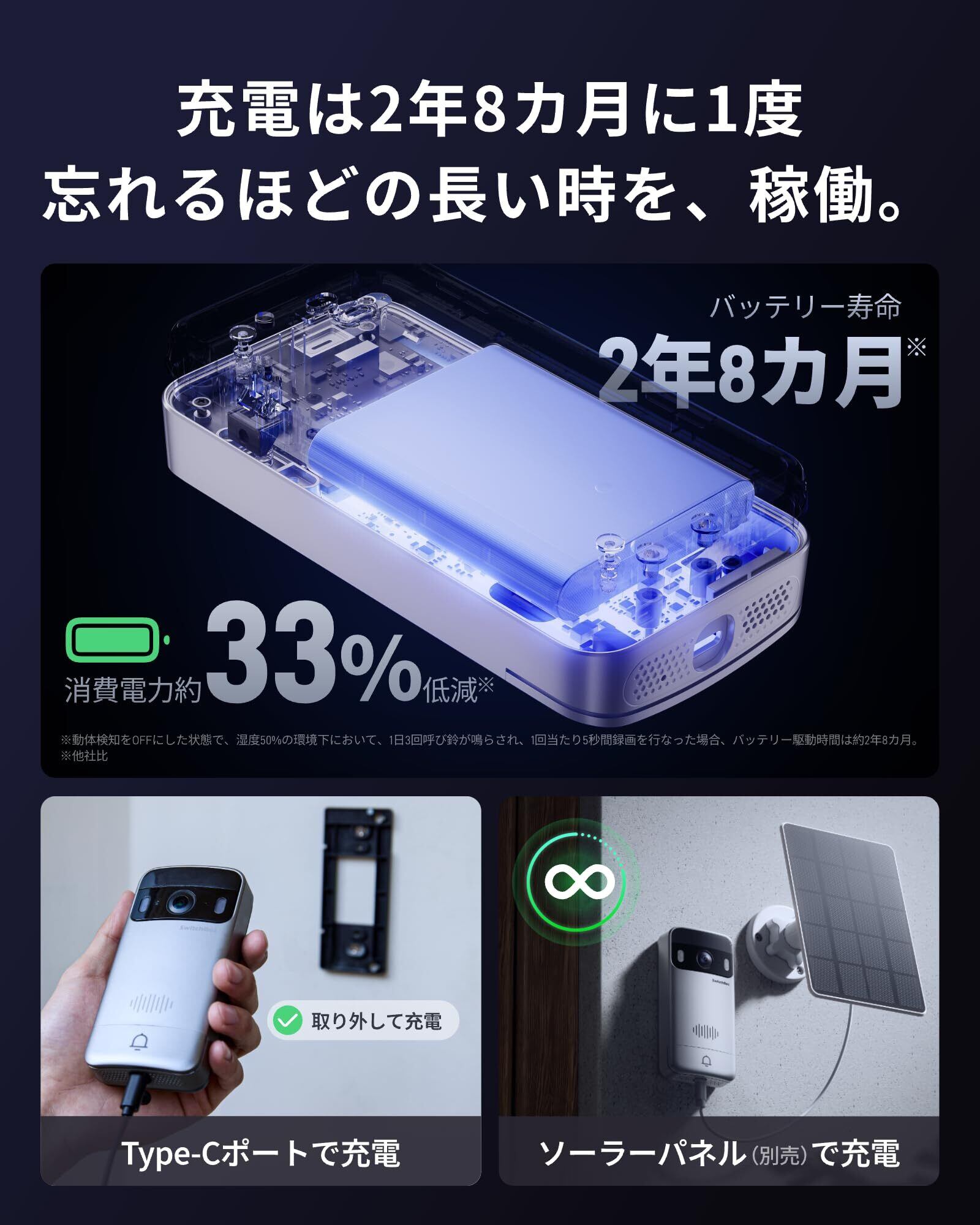 【1度の充電で2年8カ月使える最強バッテリー】玄関子機は5000mAhの大容量バッテリーを採用。スマホと同様にType-Cケーブルで充電するだけで、繰り返し使えます。バッテリー駆動時間は2年8カ月と超長持ち。電池の手間がかからず、維持費用の削減にもなります。一般的なドアホン製品に比べて、消費電力は約33%低減。ソーラーパネル(別売)を使えば、太陽光発電によって充電不要に。一戸建てにもおすすめです。