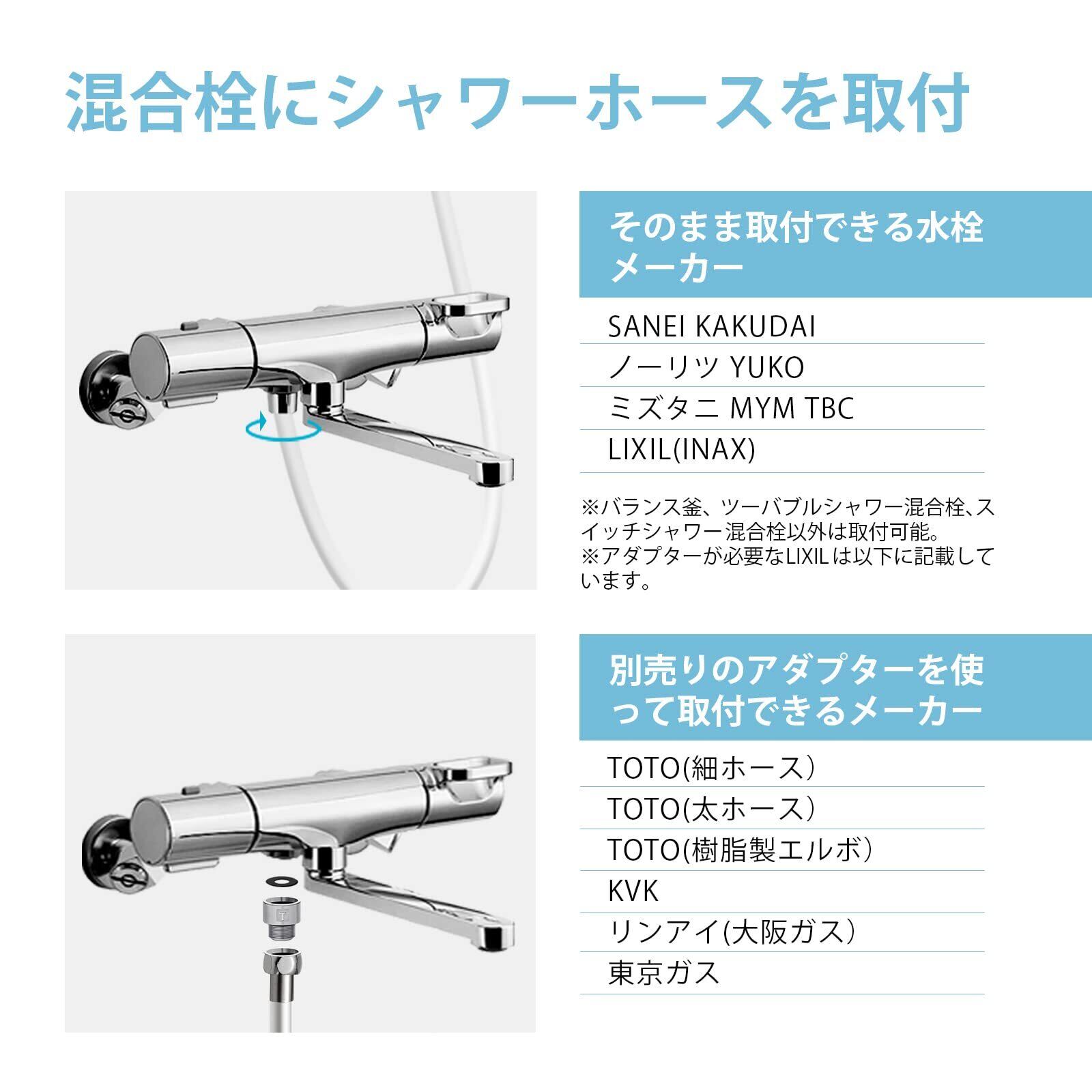 [適用する混合栓メーカー] 本品と混合栓を接続する側のネジサイズはG1/2です。本品はLIXIL(INAX),SAN-EI,MYMの混合栓にそのまま取付けできます。※LIXIL(INAX)バランス釜、ツーバブルシャワー混合栓、スイッチシャワー混合栓以外は取付可能です。