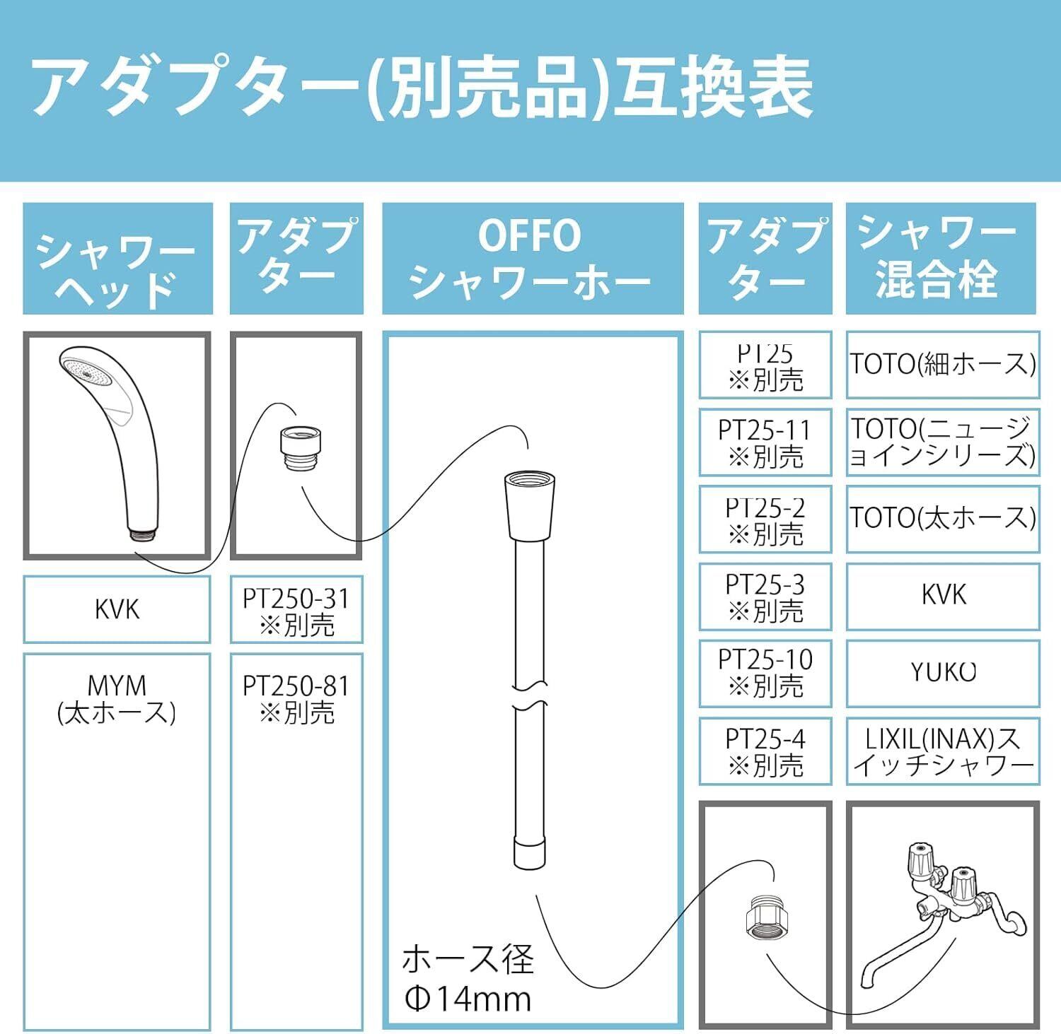 [適用するシャワーヘッドメーカー] 本品とシャワーヘッドを接続する側のネジサイズはG1/2です。本品はTOTO、LIXIL(INAX)※バランス釜除外、SAN-EI、カクダイのシャワーヘッドに直接取付できます。一部シャワーヘッドはネジサイズは合いますが、ヘッド根元のo-ringが邪魔になって接続できない可能性があります。その場合、シャワーヘッド根元のo-ringを取り外してください。o-ringを取り外した後に、水漏れが発生する場合、付属のパッキンを追加してく見てください。