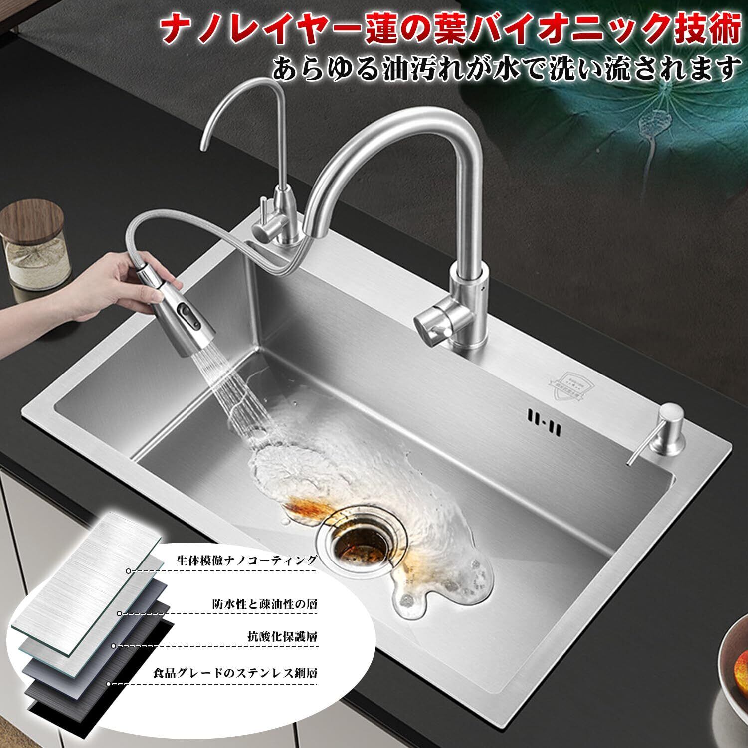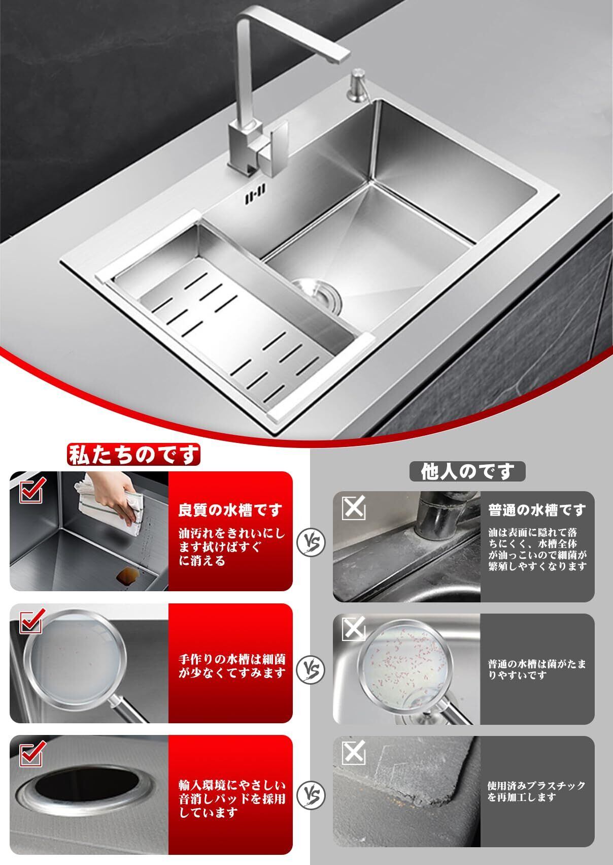 【最新ナノ技術を採用】エコ材質、シンクは大きくて深い、汚れを防いで色褪せない、重圧に抵抗して、耐熱性、耐食性、清潔やすくて、磨耗に耐えて、3.0 MM厚いシンク。シンクは、密閉性が高く、堅くて、大きな水槽のためにカスタマイズされた設計で、変形不可能、破損や水漏れがなく、掃除が簡単で。