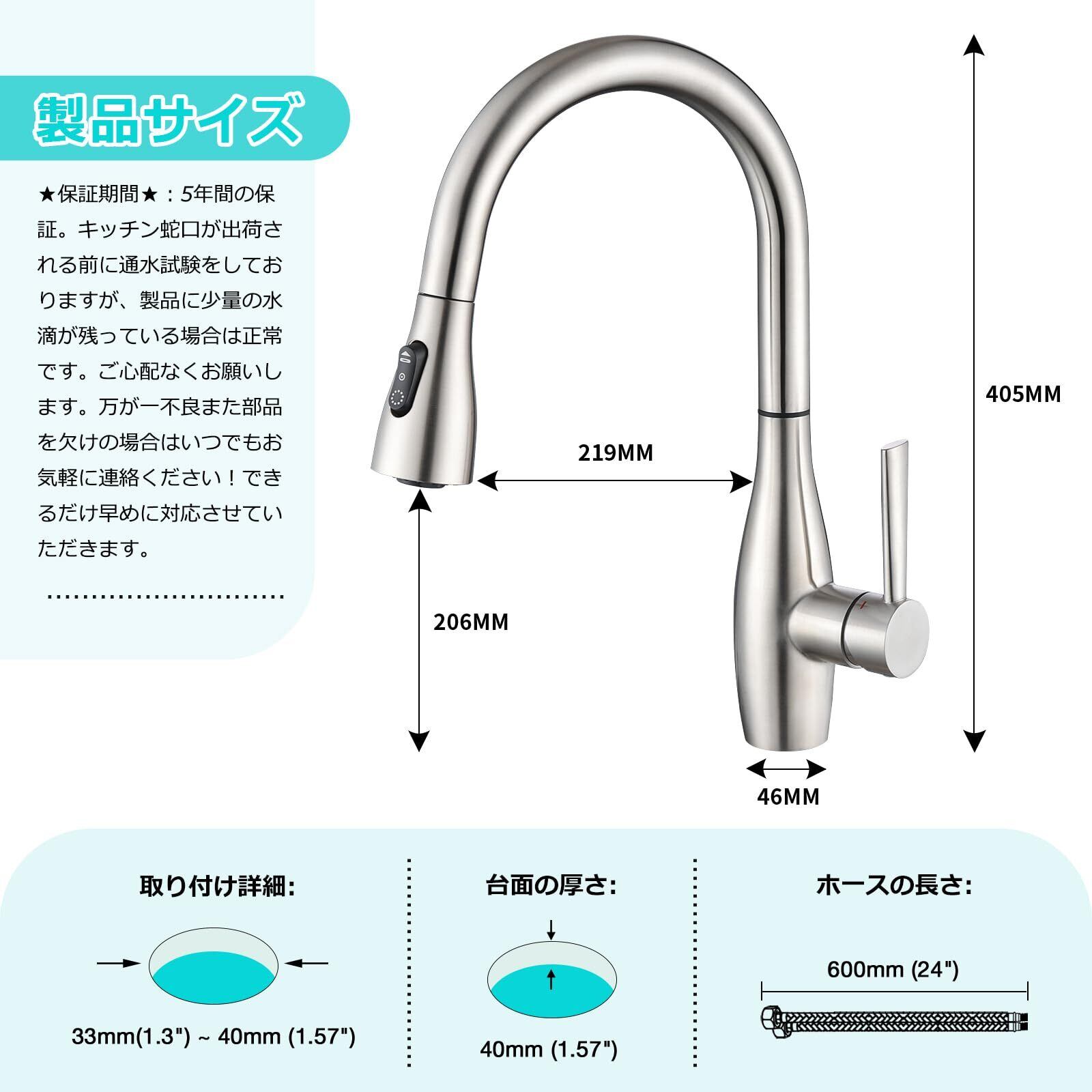 セット内容:蛇口x1、重力 ボールx1、2つの入口管長さ は50cm(G1/2ナッツ)引き 出しホースx1、電池弁x1、 電池ケースx1、取り付け金具 (黒い台座、固定用ナットパッ キン等)電池別売り。期間:3年間の。キッチン蛇口が出荷される前にテスト検査を経ておりますが、製品に少量の水滴が残っている場合は正常です。ご心配なくお願いします。万が一不良また部品を欠けの場合はいつでもお気軽に連絡ください!できるだけ早めに対応させていただきます。