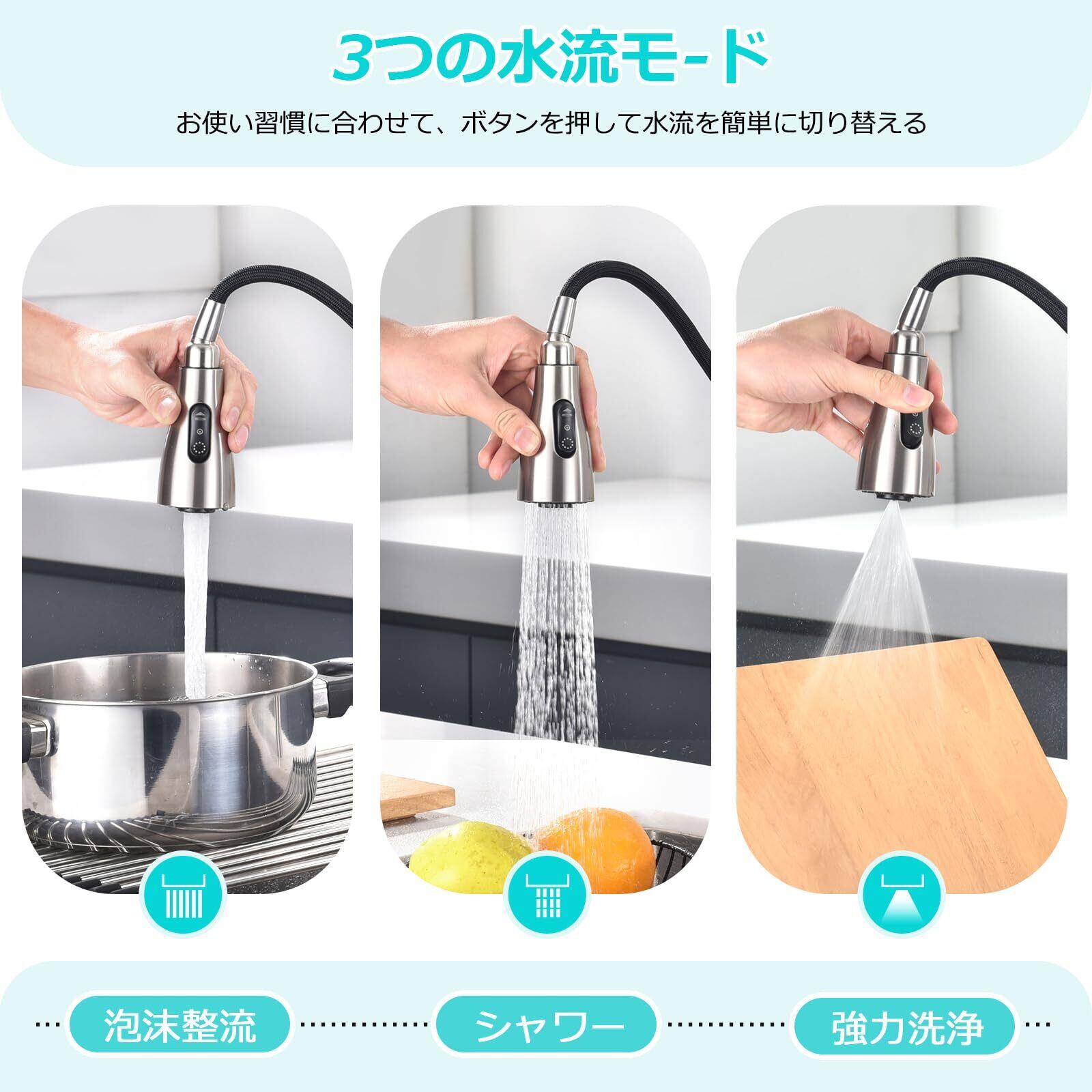 ❀3つの水流モード❀:ヘッド先端のレバーのボタンを押すと、3つの水流に切り替え可能。水を汲んだり集中して使いたい場合は整流、キッチンお掃除など広い範囲に水を流したい場合はシャワー、頑固な汚れには強力洗浄モードに切り替え、用途に応じて使い分けが可能。
