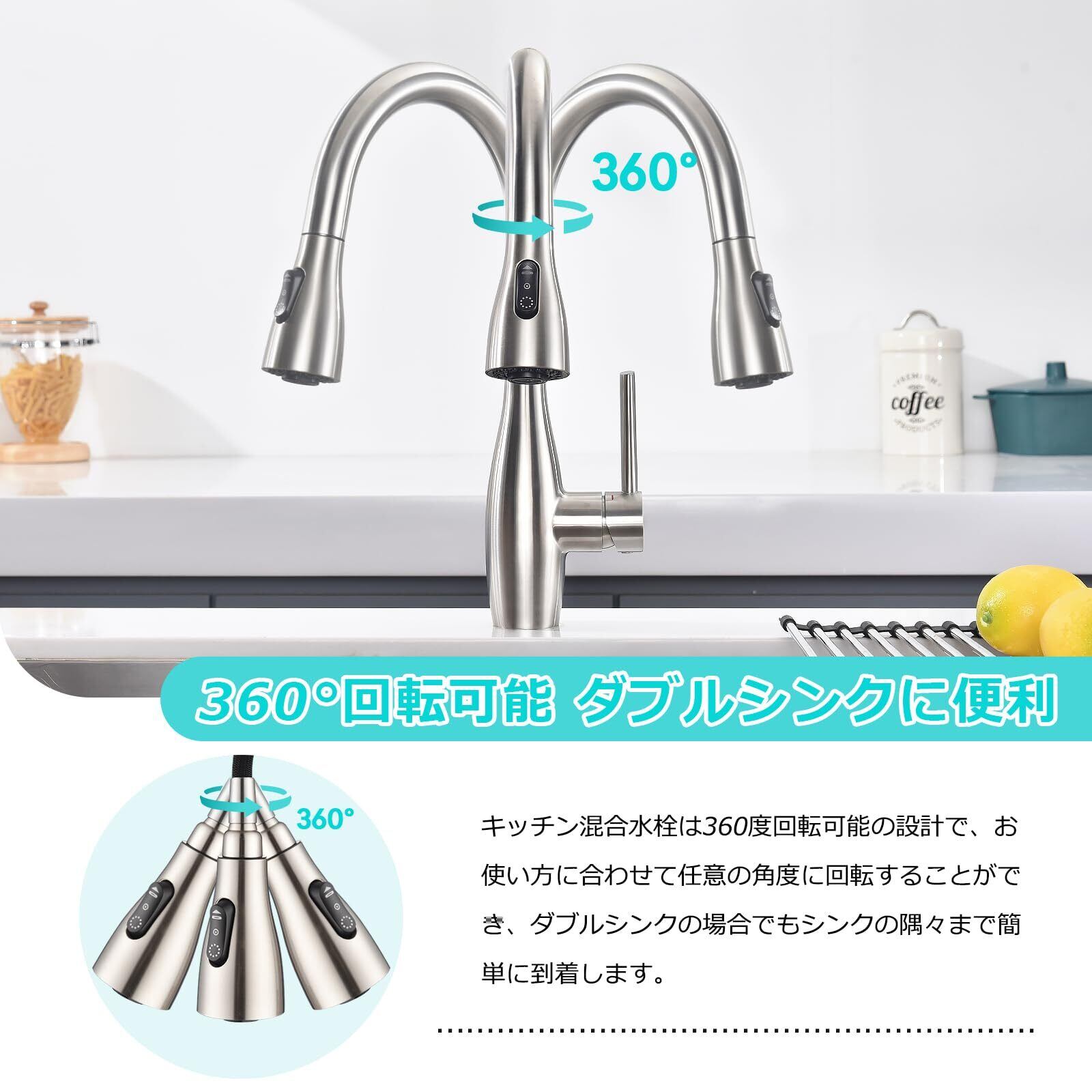 CREAキッチン蛇口 混合水栓 キッチン 水栓 タッチセンター水栓 蛇口シャワーホース 引出し式水栓3つ水流モード 360度回転 シングルレバーステンレス製