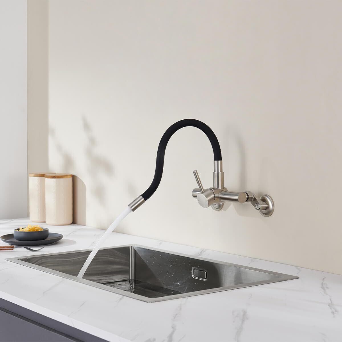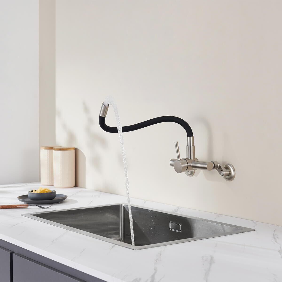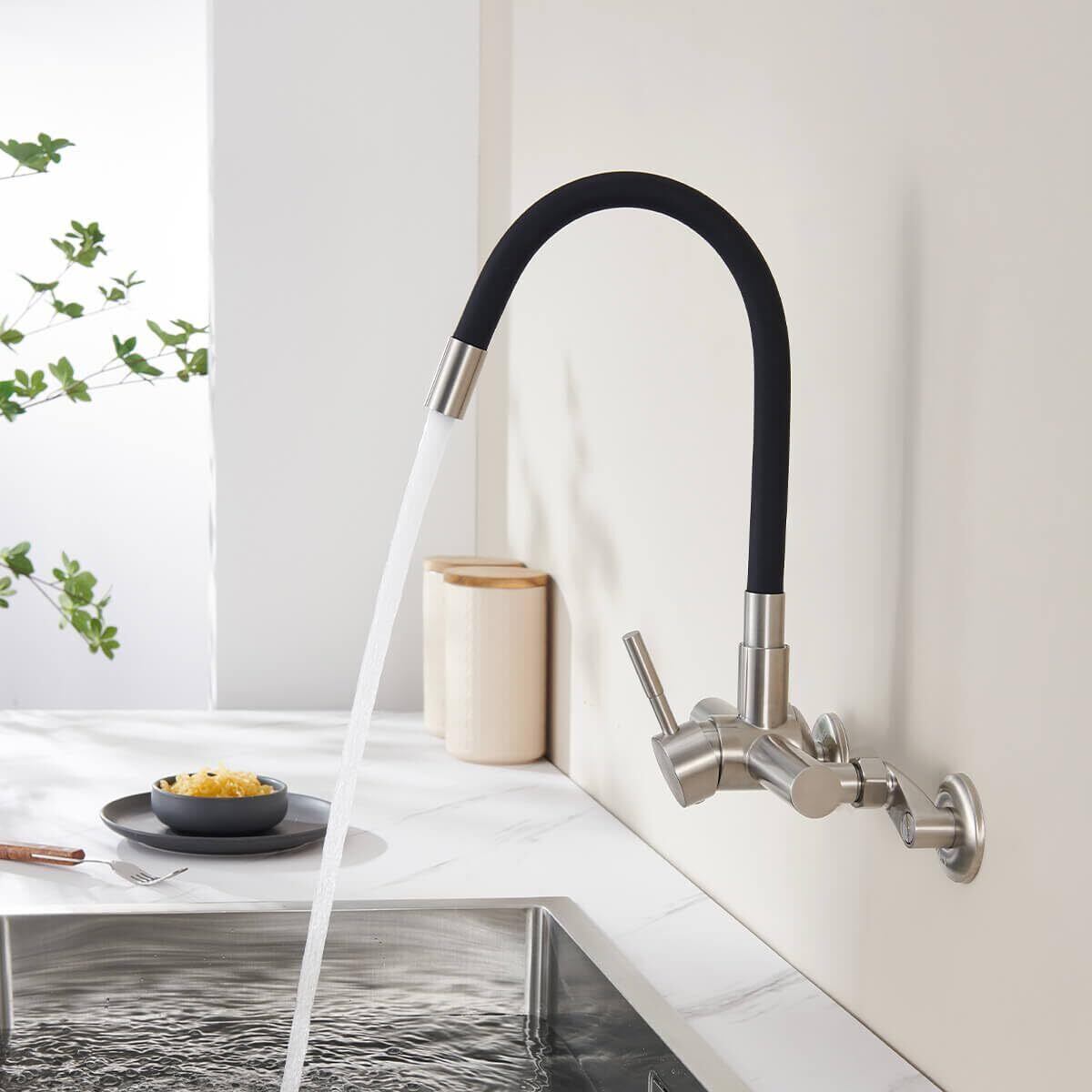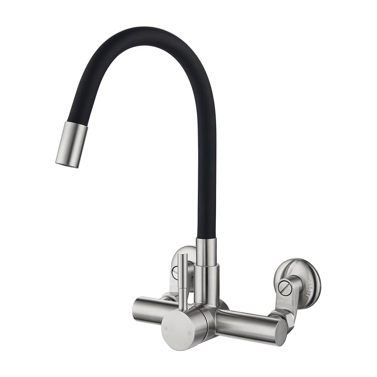 【洗練デザイン】洗練された多用途の壁付水栓、バス/洗面所/キッチンに対応。シルバーの色はブラックと組み合わせて空間にアンティーク調を飾れる。キッチンシンクとは最も完璧な組み合わせで、使用してない時でも部屋ではまるで高級芸術品のようです。