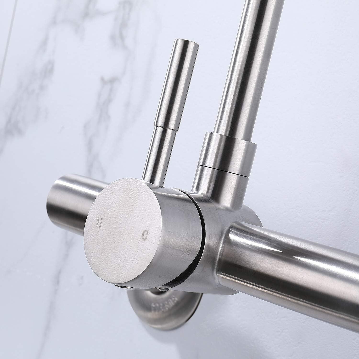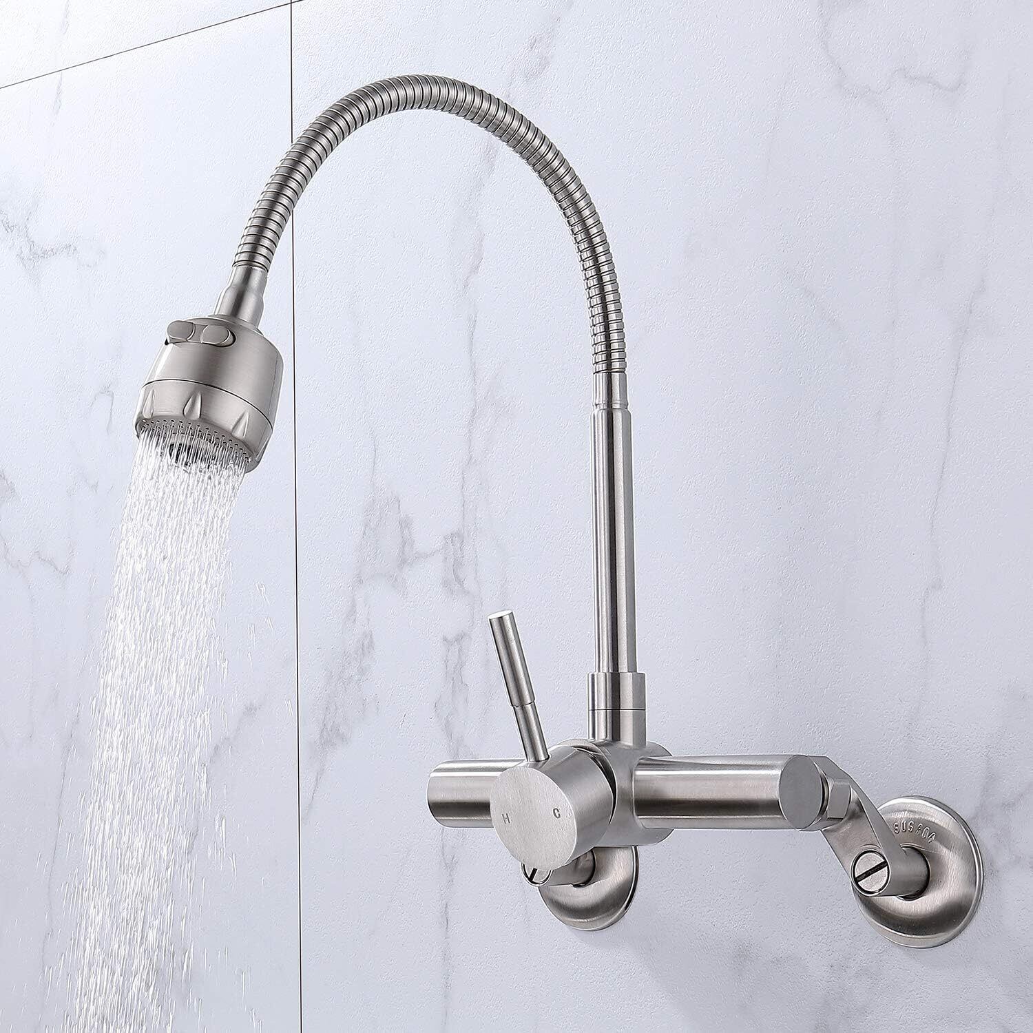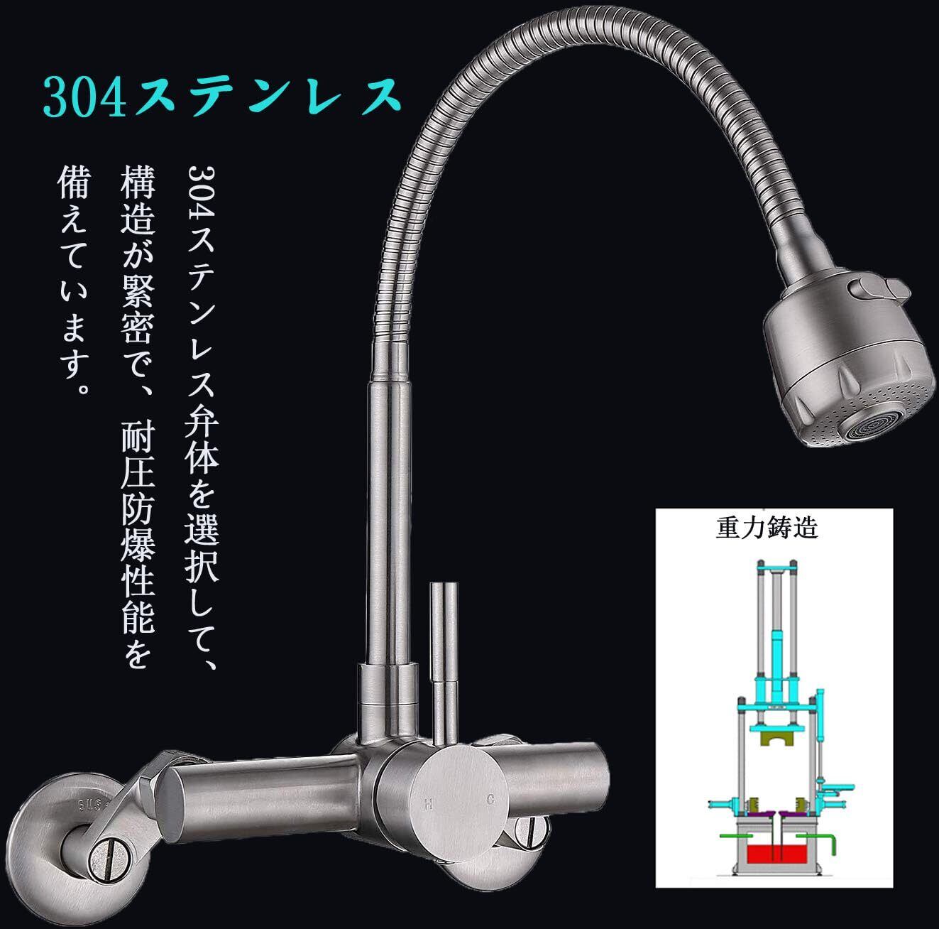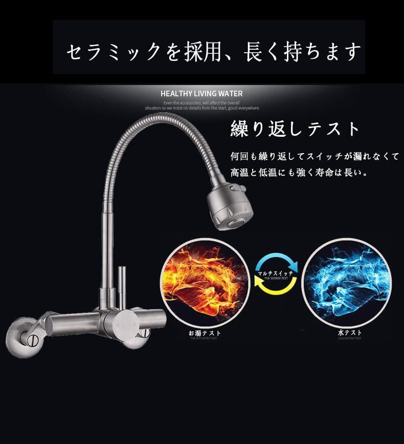 【洗練デザイン】バルブコア素材:セラミックレバーバルブ。本体素材:ステンレス。吐水口素材:高級ABS樹脂。洗練された多用途の壁付水栓、バス/洗面所/キッチンに対応。シルバーの色は空間にアンティーク調を飾れる。キッチンシンクとは最も完璧な組み合わせで、使用してない時でも部屋ではまるで高級芸術品のようです。