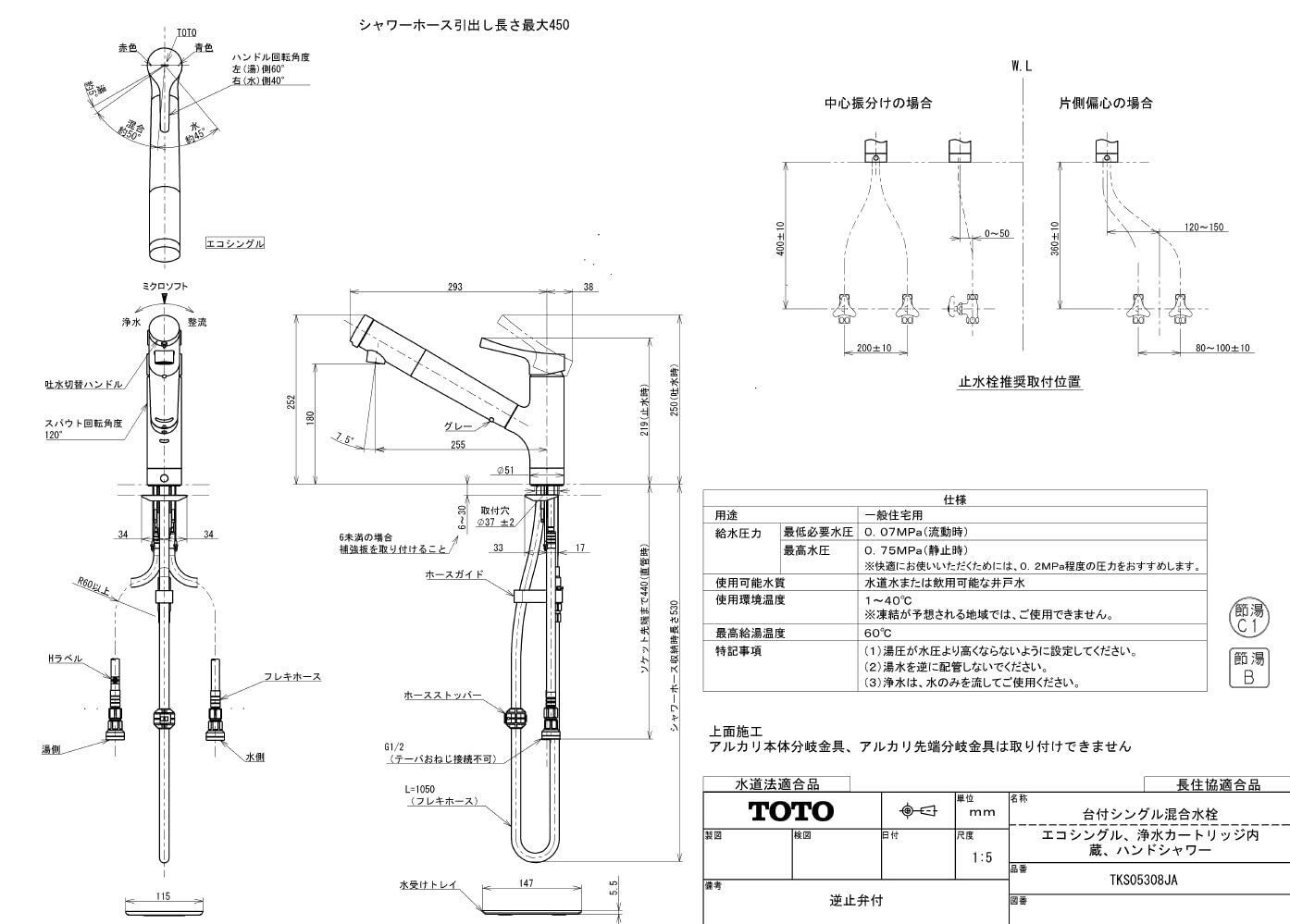 従来品TKS05308Jからの変更点→引出しホースの材質を樹脂ホースからメタルホースに変更、これに伴いスパウト回転角が150°→120°に変更