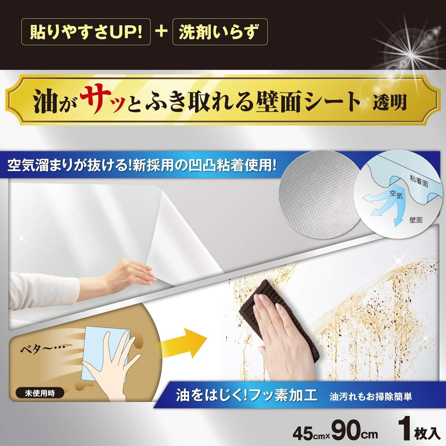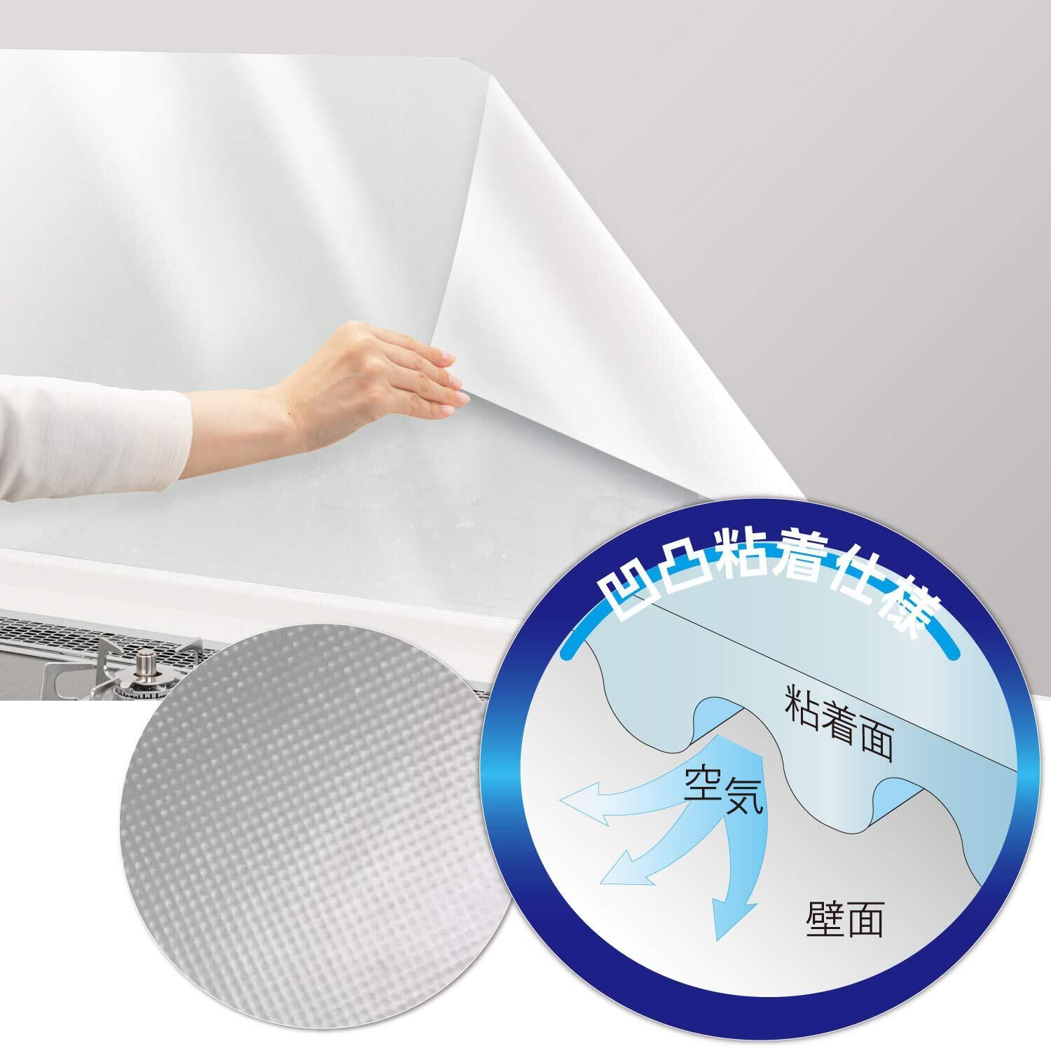 キッチン壁面のベタベタ汚れを防止するシートです。凸凹加工で貼るときに気泡やシワが入りにくい。汚れても拭き取りやすい表面フッ素加工。