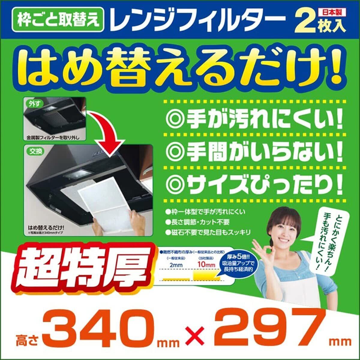 ●深型レンジフードのフィルターサイズ 高さ340mmX幅297mmに適合 ●枠付きなので、まるごと取替え 面倒なカットやサイズ合わせが不要で、取替えラクラク! ●ピッタリサイズで収まるので見た目もスッキリ! ●取替えが簡単なので、時に手が汚れにくい ●フィルターが超特厚で油煙をしっかり吸着 取替え回数も少なく経済的