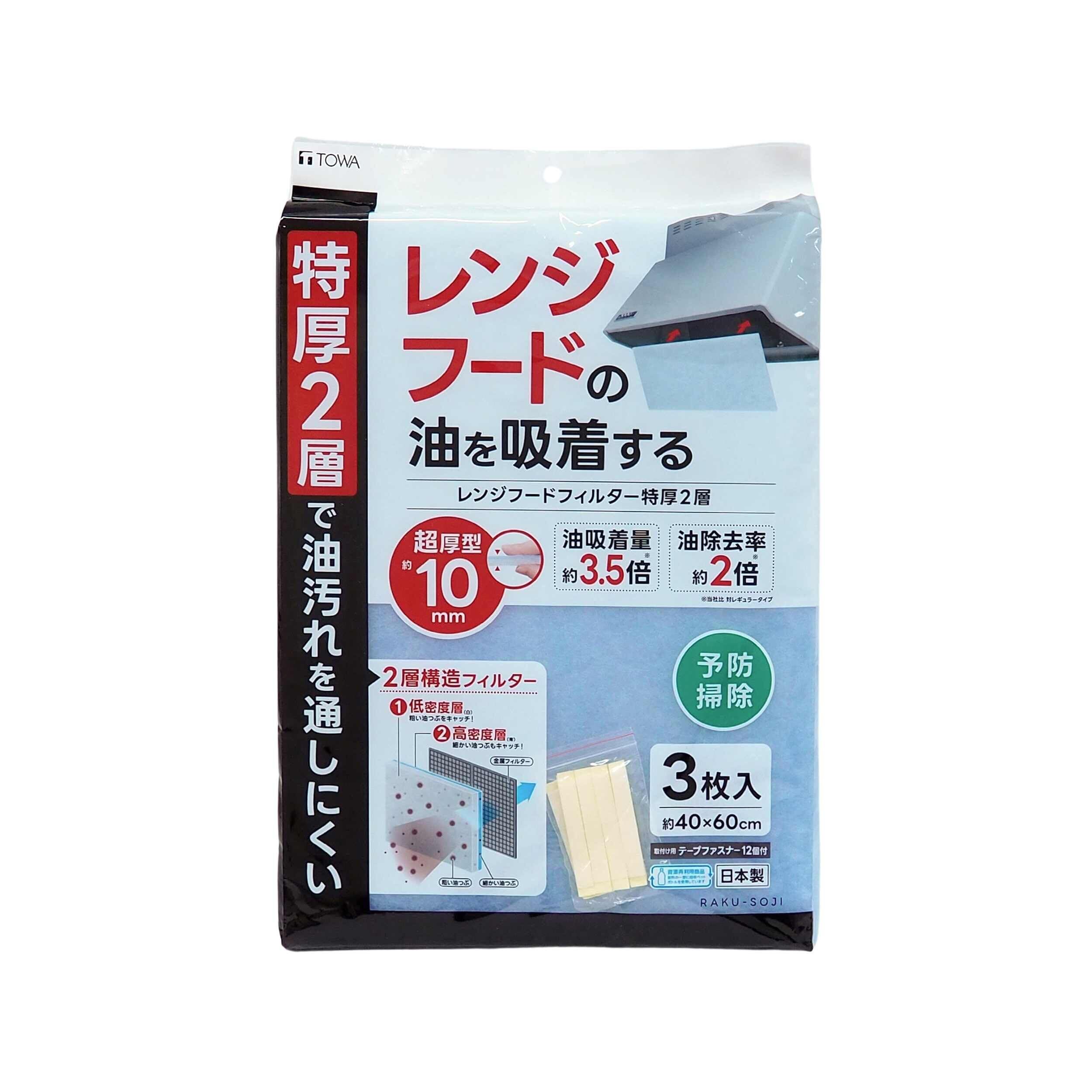 東和産業 RSレンジフードフィルター 特厚2層 3枚入 油吸着量約3.5倍 油除去率約2倍 約40×60cm テープファスナー付日本製 超厚型 10266