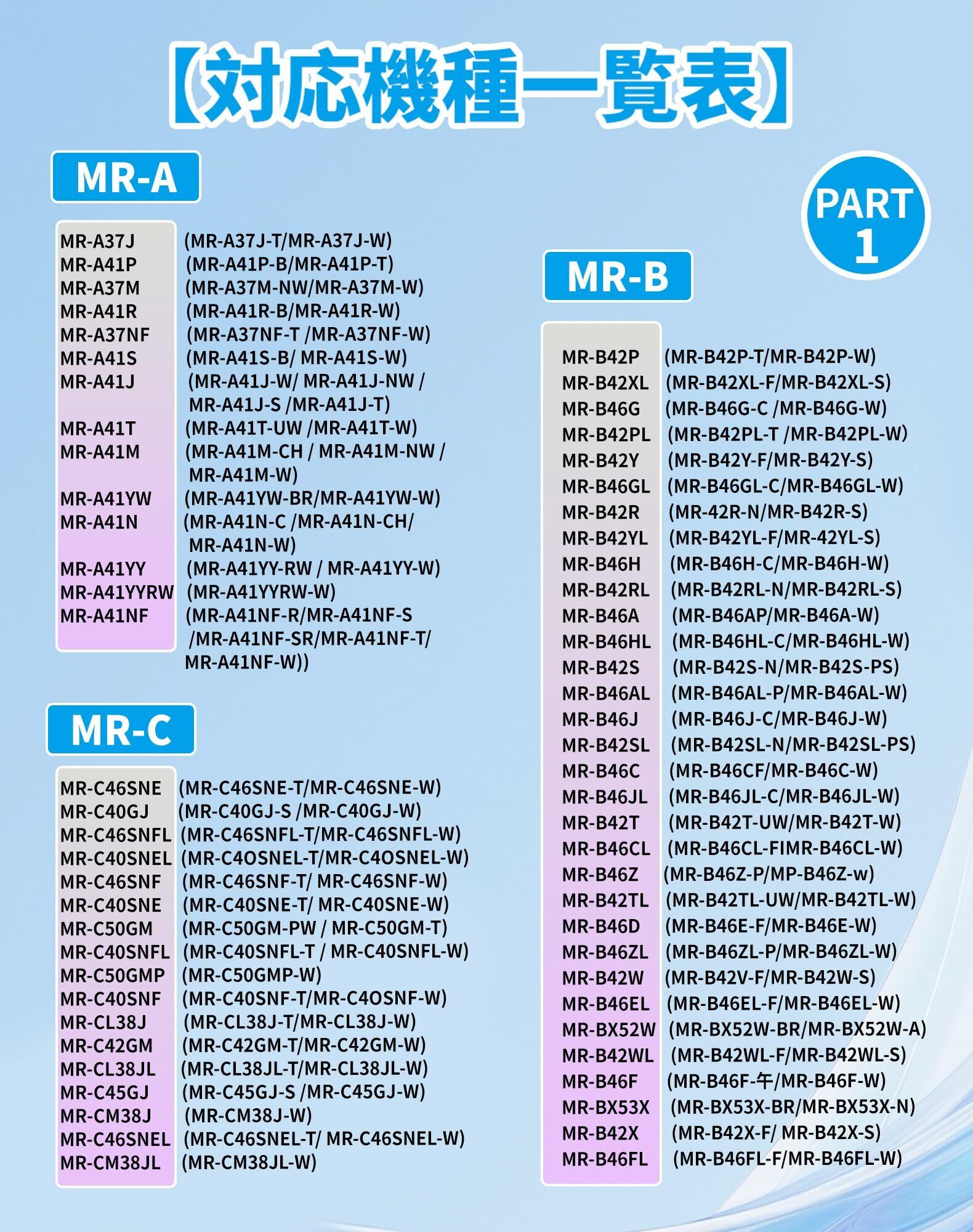 多くの三菱製氷機モデルに対応: 以下の機種に対応:MRPR-01FT、MR-JX52W、M20VJ5526、MR-JX53Z、MR-JX61Y、M20KW0526、M20KWO526、MR-JX60W、MR-MB45E、MR-WX47C、MR-WX71Z、MR-B46D、MR-RX47T、MR-RX52T、MR-WX60A、MR-MX50F、MR-MX57D、MR-B46A、MR-R47W、MR-WX47D、M20CM5526、MR-A37JT、MR-A37M、MR-A37NF、MR-A41J、MR-A41JS、MR-A41M、MR-A41N、MR-A41NF、MR-A41YW、MR-A41YY、MR-B42Tなど。※詳細な対応機種は商品画像をご確認ください。