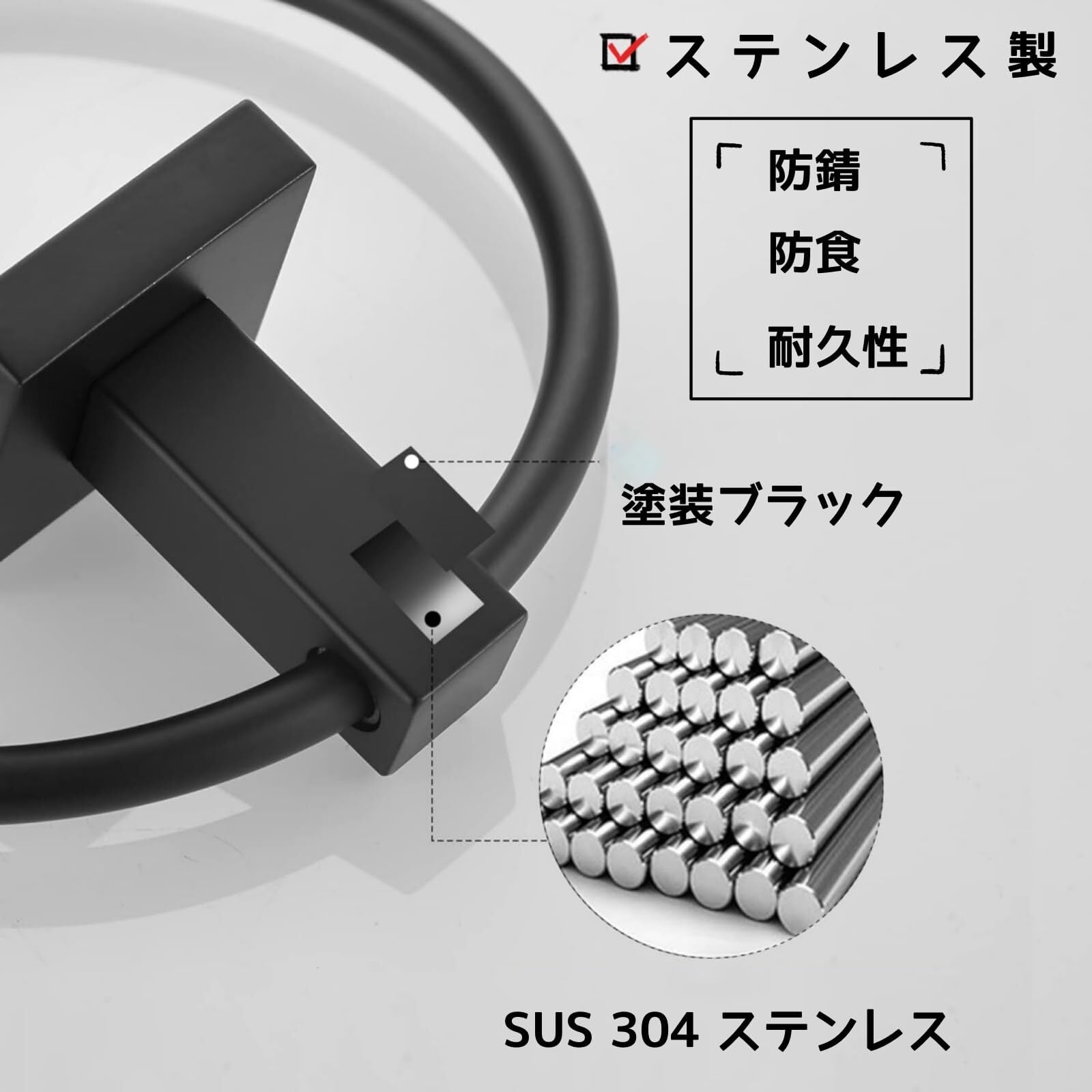 【つや消しの黒でとてもオシャレ】本体はマットな黒色質感がおしゃれで、モダンでデザインで見た目に高級感があります。リングは耐久性のあるステンレス素材を採用、表面に「防水」「防腐」「防錆」 の特殊加工を施すことにより、水廻りでの使用で心配される変色や錆付きなどがなく、末永くご愛用いただけます。