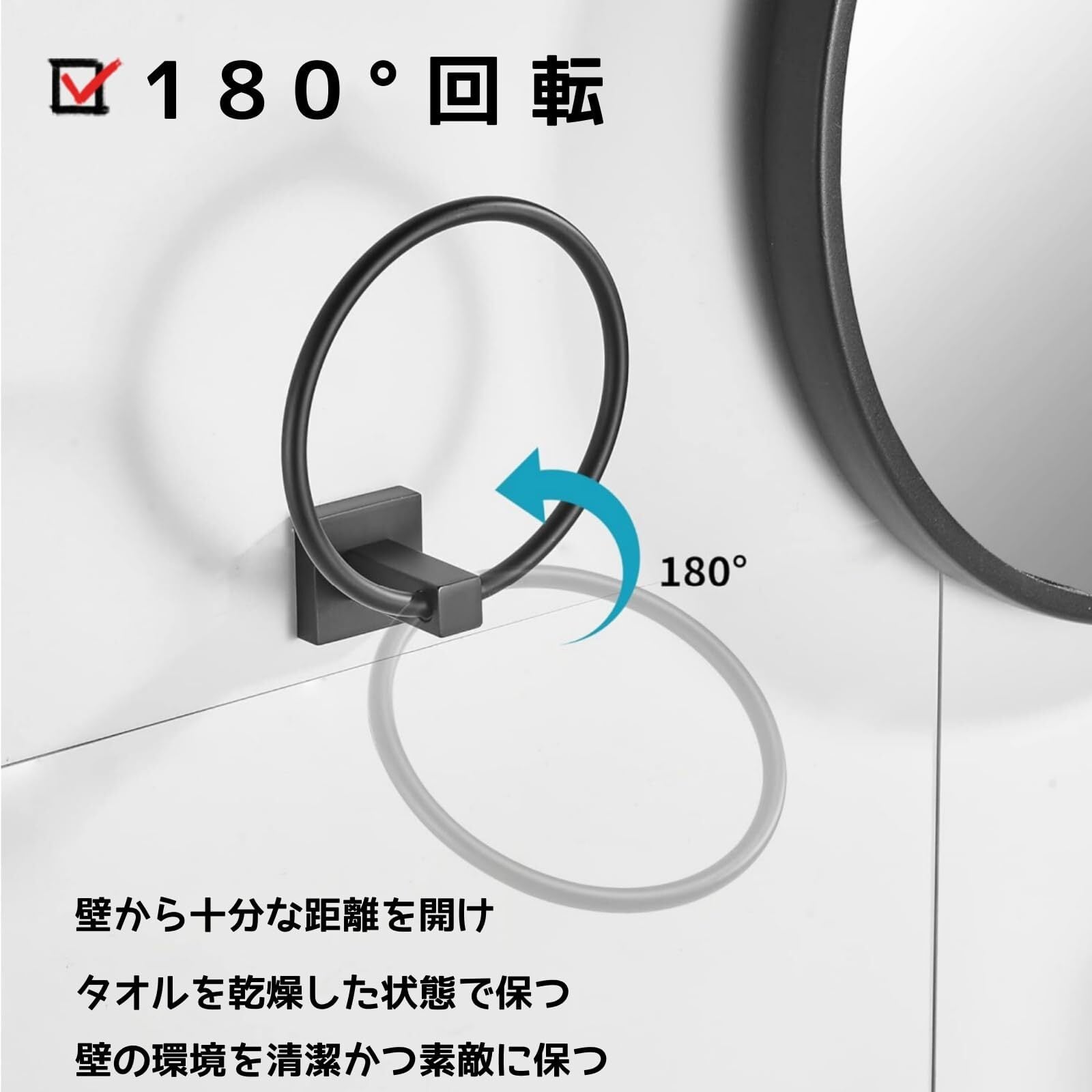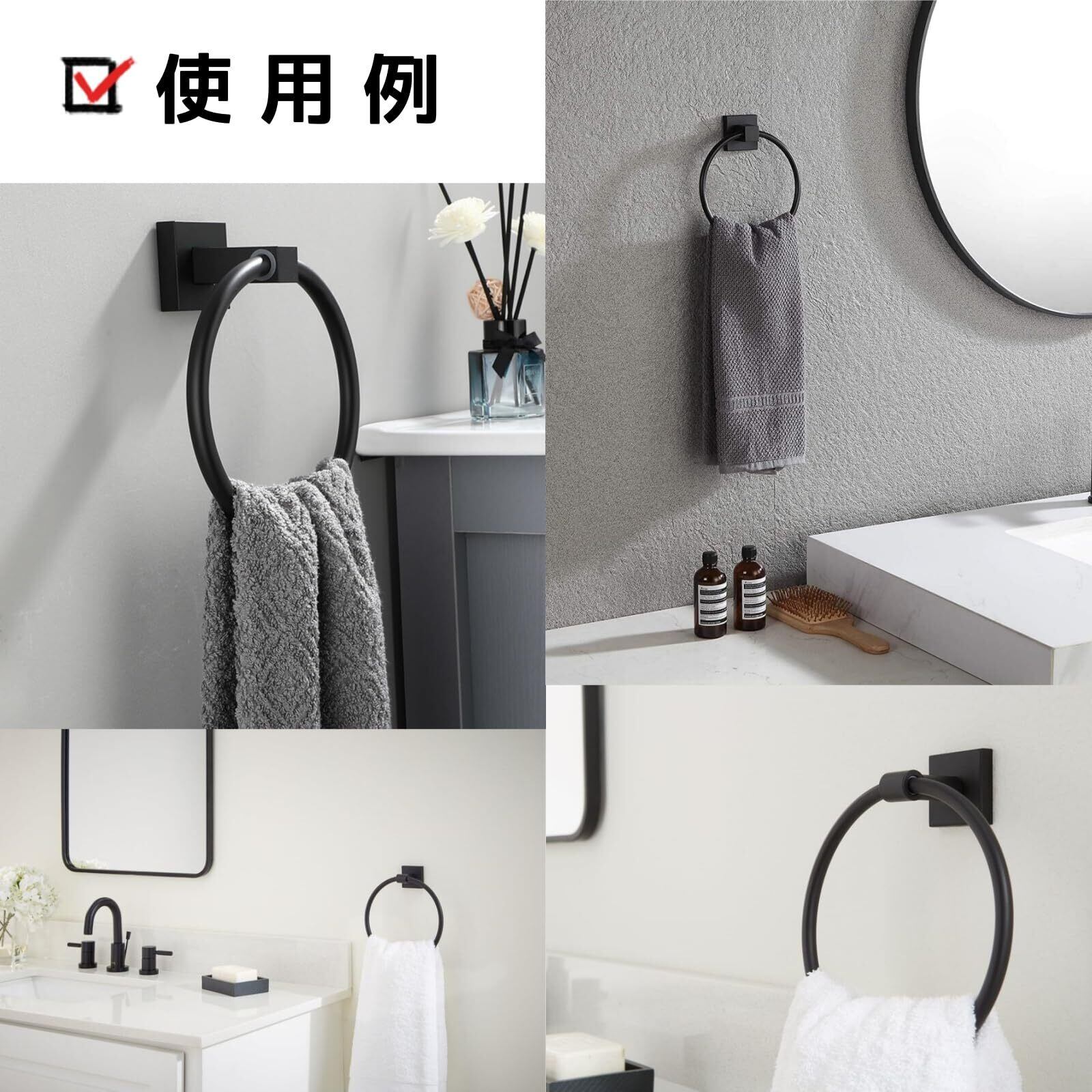 【収納上手のタオル掛け】スタイリッシュなデザインでスペース節約です。スペースを有効に収納として使える便利なリングです。タオルリングの部分は壁と距離があるので、タオルが壁に接せず、衛生的です。壁の環境をキレイに保つことができます。