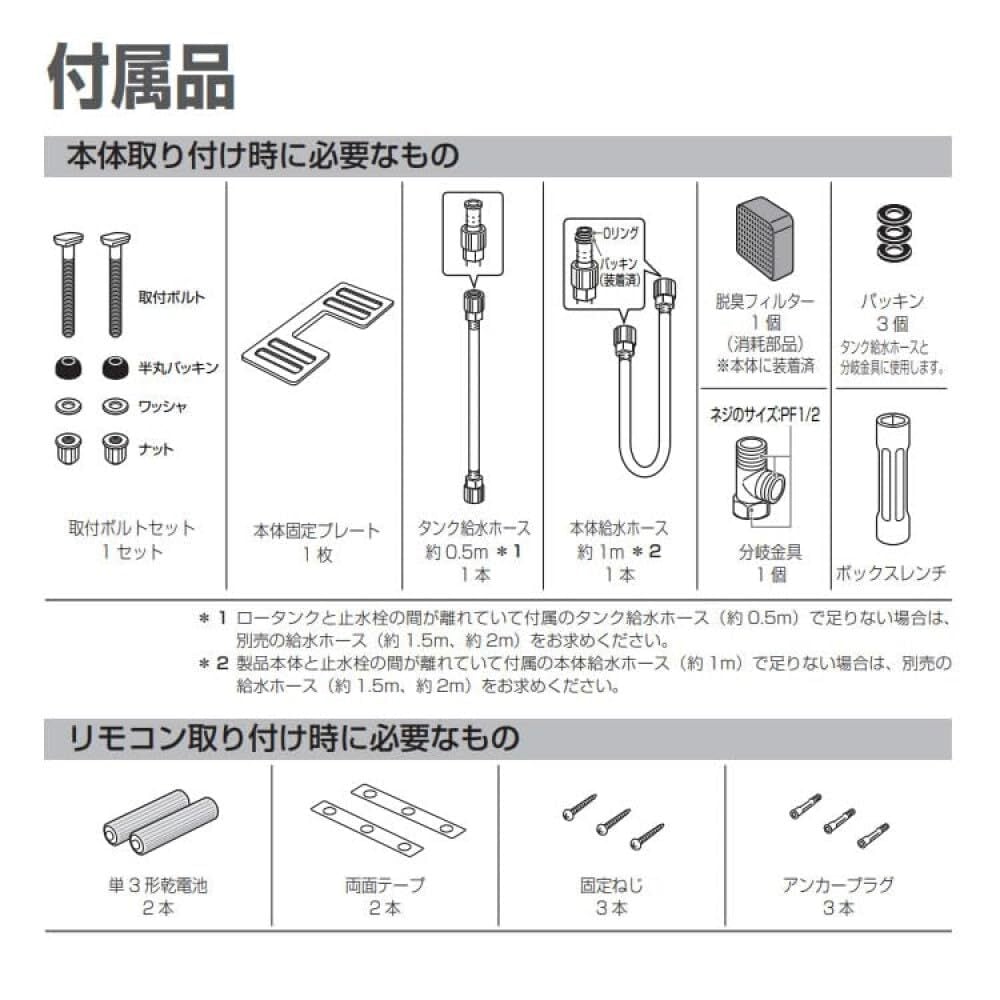 安全装置:サーモスイッチ、温度ヒューズ、水位センサー ・暖房便座装置:温度調節3段階調節(約33℃〜40℃)、およびヒーター「切」 ・安全装置:温度ヒューズ ・脱臭装置:脱臭フィルター触媒脱臭 ・脱臭風量(m3/分):通常0.11 ・そのほかの安全装置:漏電遮断回路内蔵
