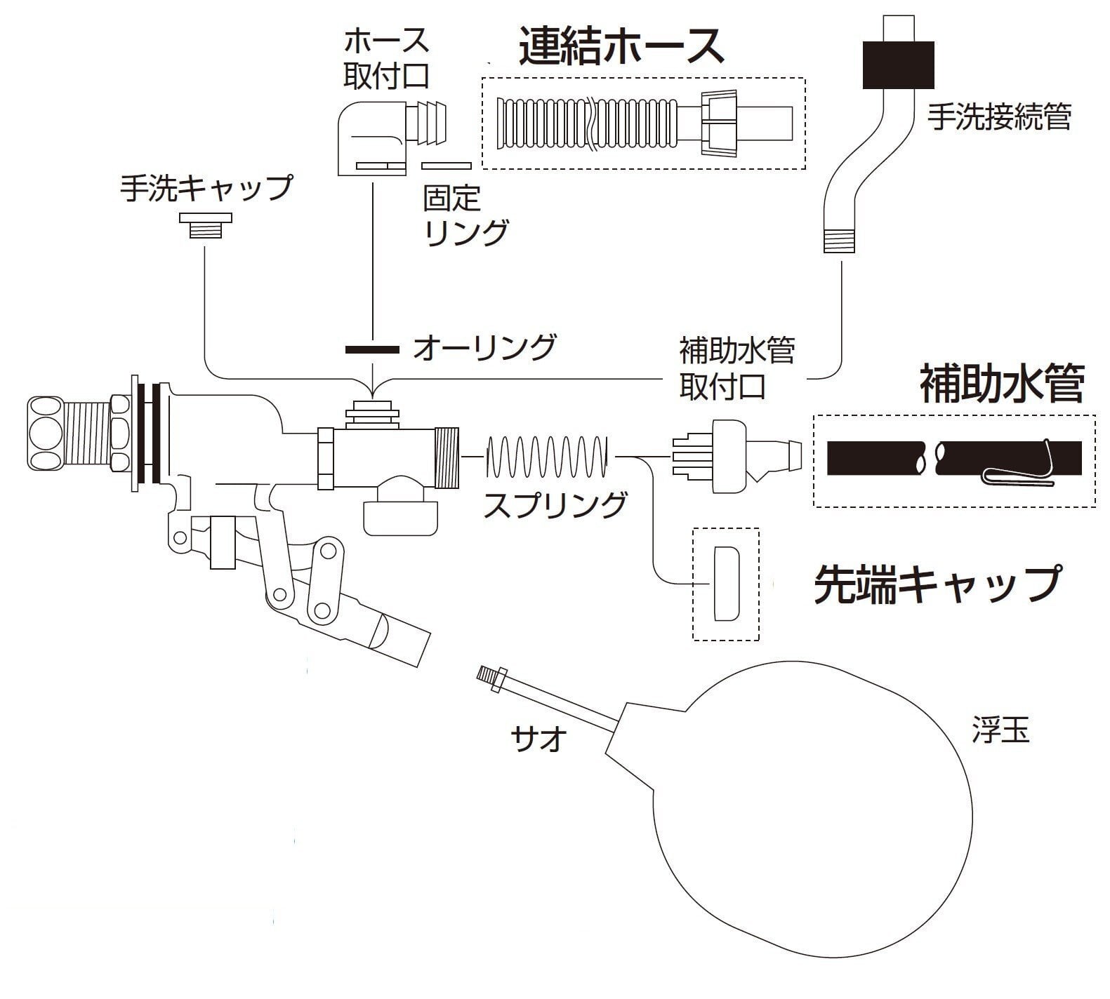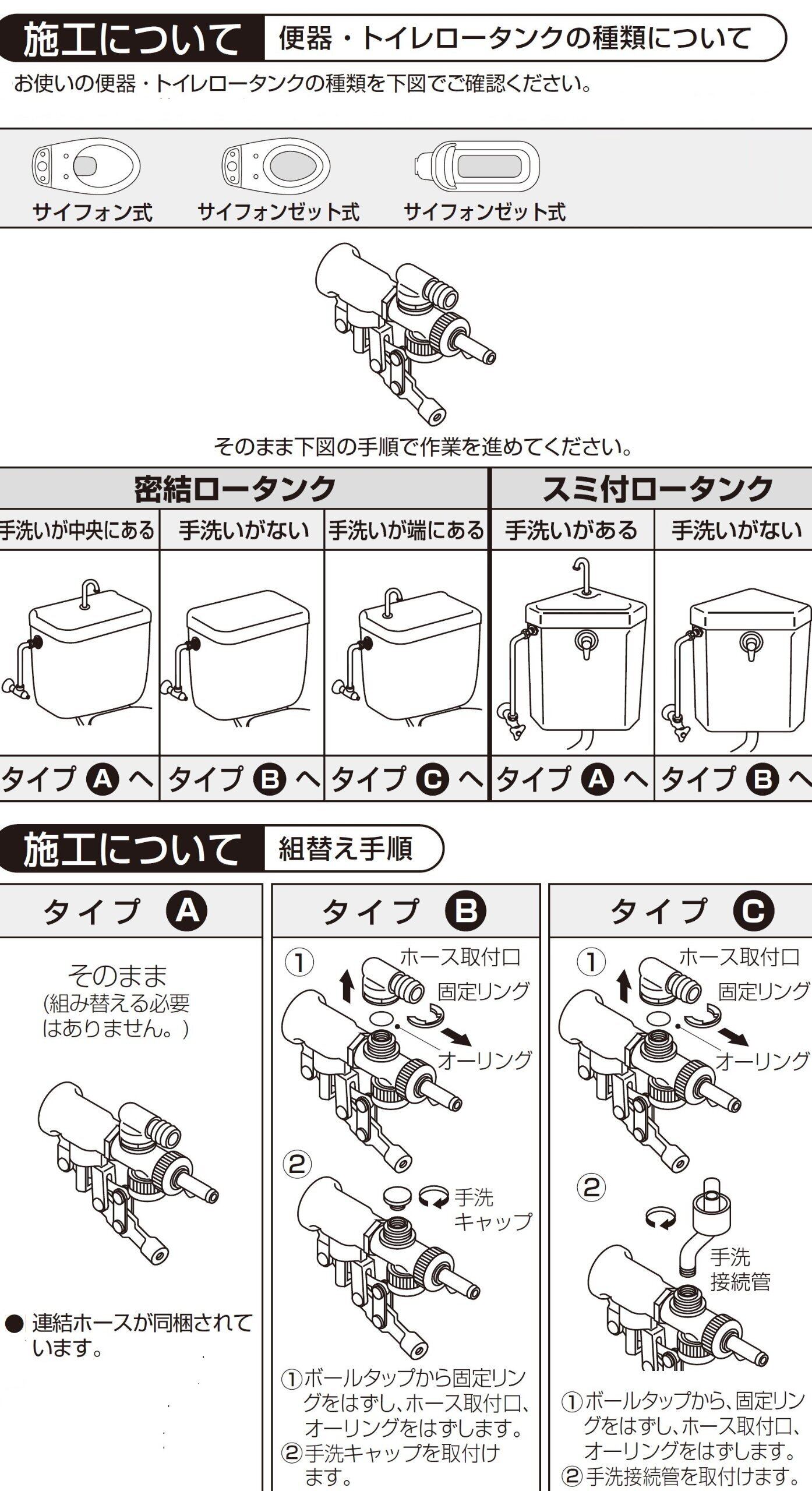 部品を組替えることにより、手洗付、平付、手洗なしのロータンクに使用できます。