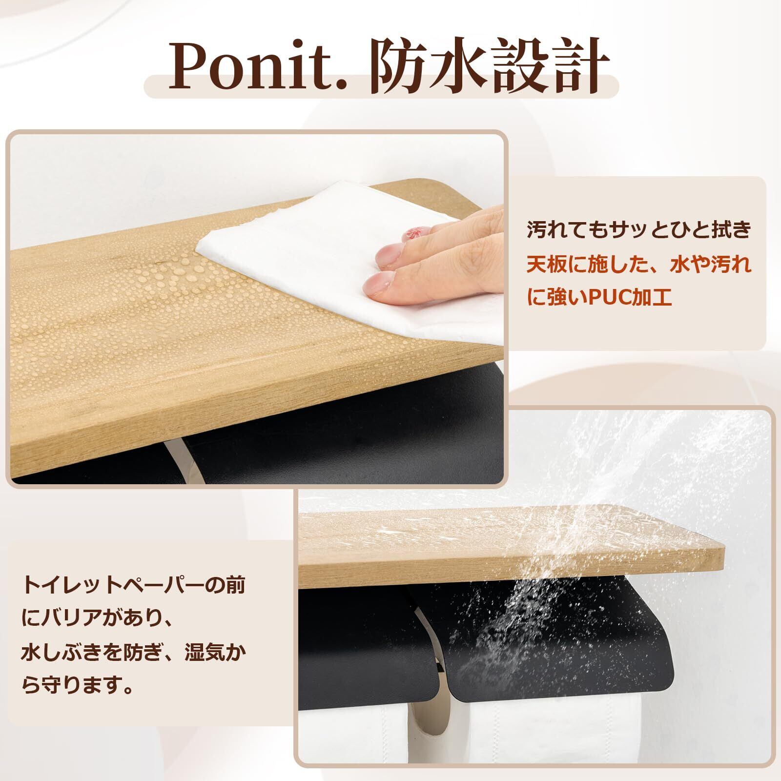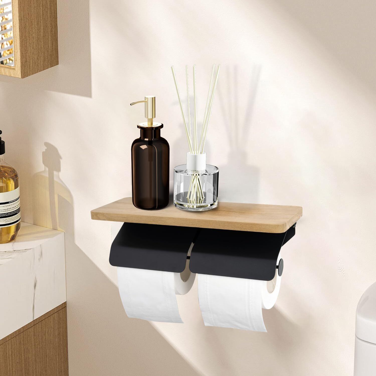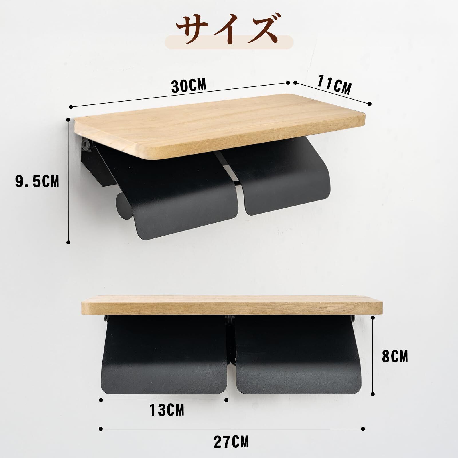 トイレットペーパーホルダー 木製 棚付き スマホ置き インテリア 賃貸 DIY おしゃれ 2連 簡単設置 補充楽 飾り棚 ペーパーホルダー 収納対応紙巻器(ナチュラル×ブラック ダブル)