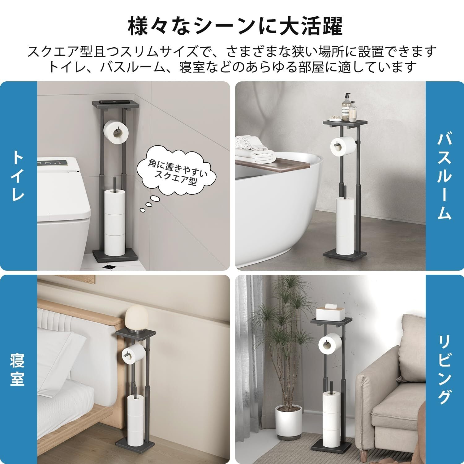 【様々なシーンに大活躍】スクエア型且つスリムサイズで、さまざまな狭い場所に簡単に設置でき、掃除する時にも簡単に移動できる自立式トイレペーパーホルダーです。頑丈フレームと木板のシンプルな設計で、インテリアに馴染みやすくて、トイレ、バスルーム、寝室などのあらゆる部屋に適しています。