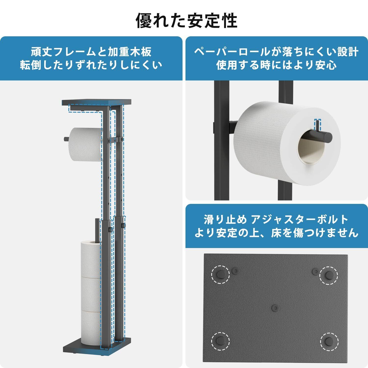 【優れた安定性】 頑丈フレームと加重木板を採用して、転倒したりずれたりしにくいトイレットペーパースタンドである上、底には滑り止め アジャスターボルトが付いており、安定性をよりアップして、床も傷つけません。また、ペーパーロールは落ちにくい設計で、安心してご使用いただけます。