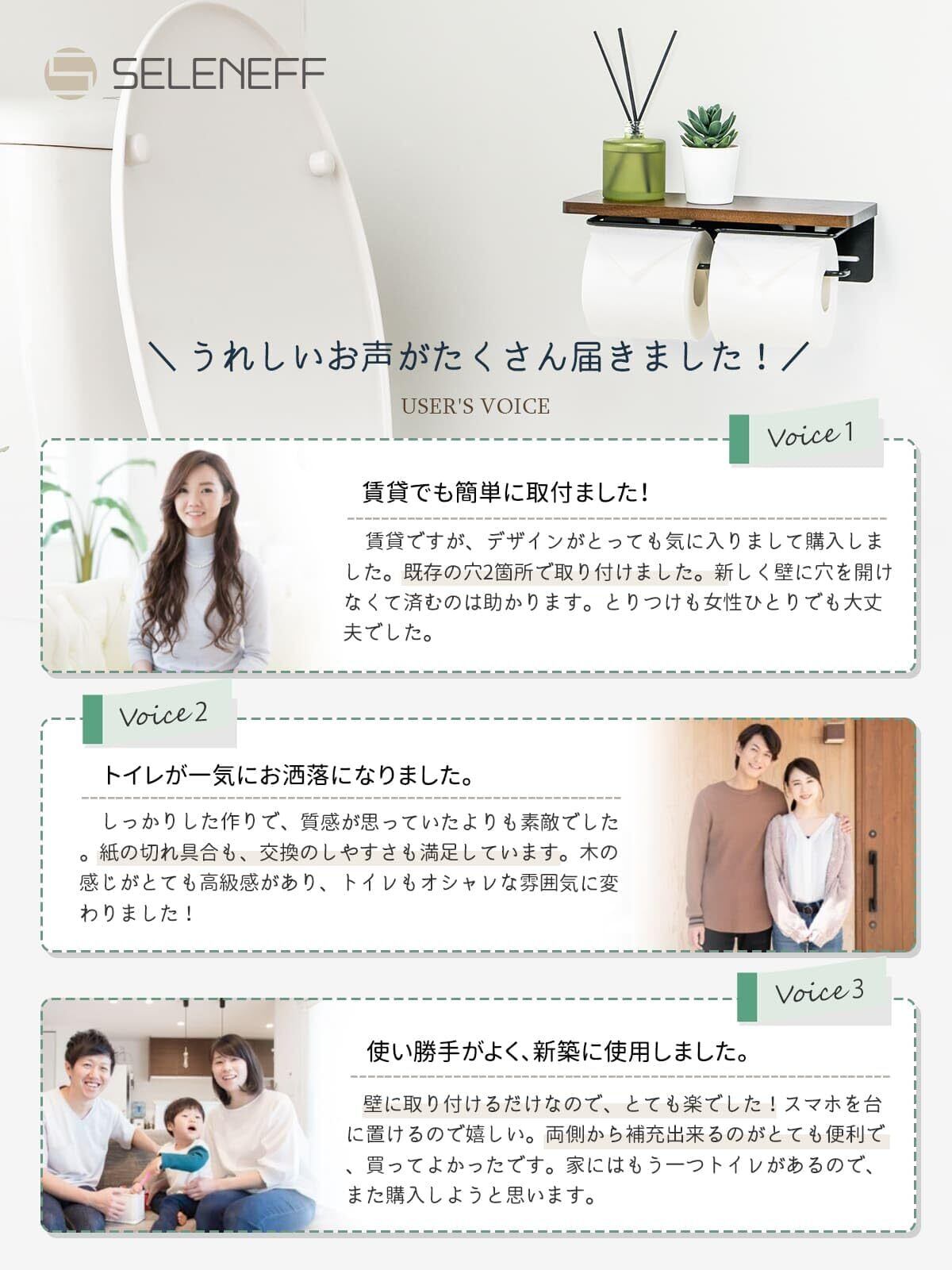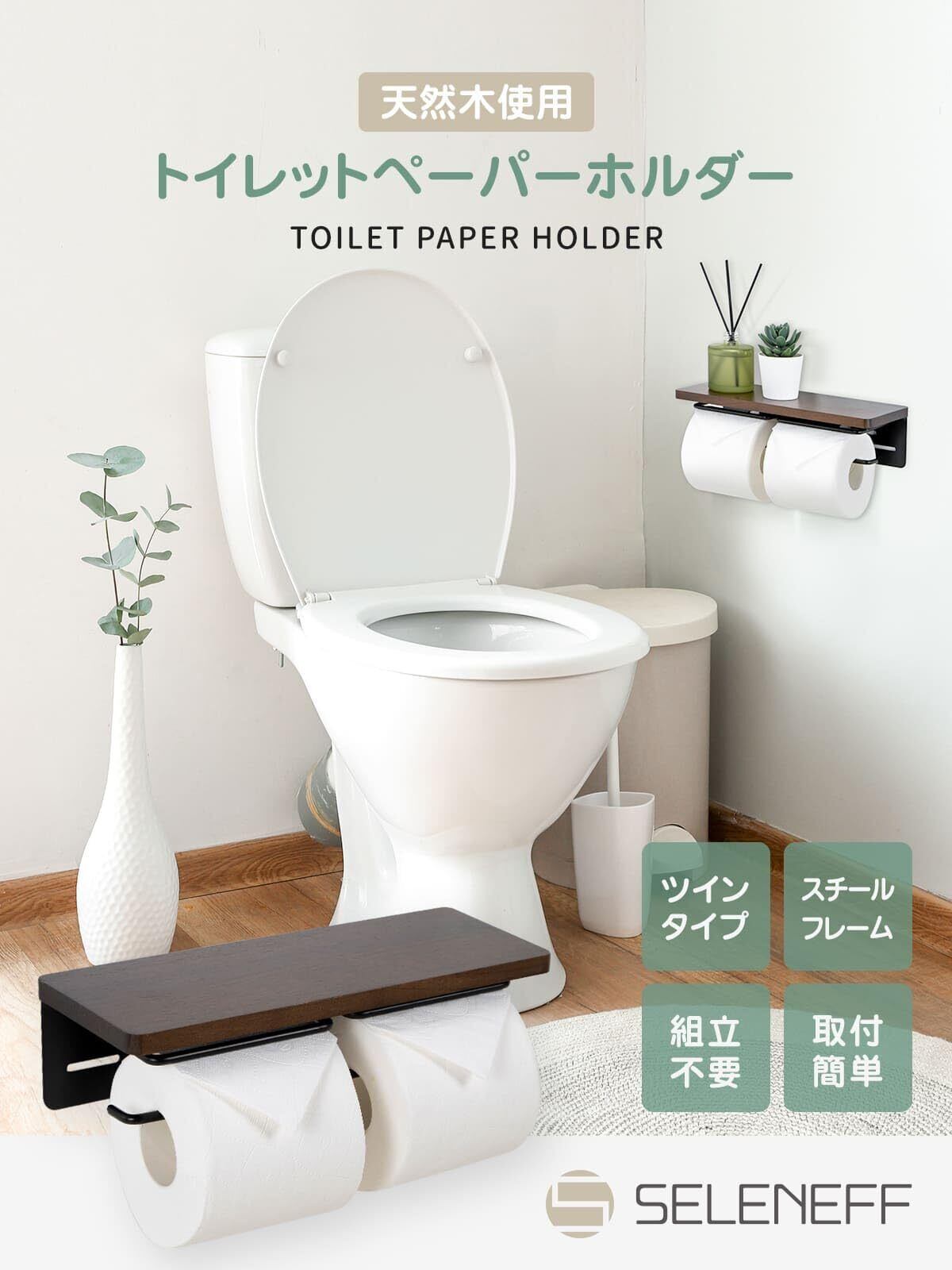 SELENEFF トイレットペーパーホルダー 2連 棚付き 木製 ダブル 北欧 木目 トイレットペーパー ホルダー スマホ置き 天然木 簡単設置 ツイン ペーパーホルダー (ナチュラル)