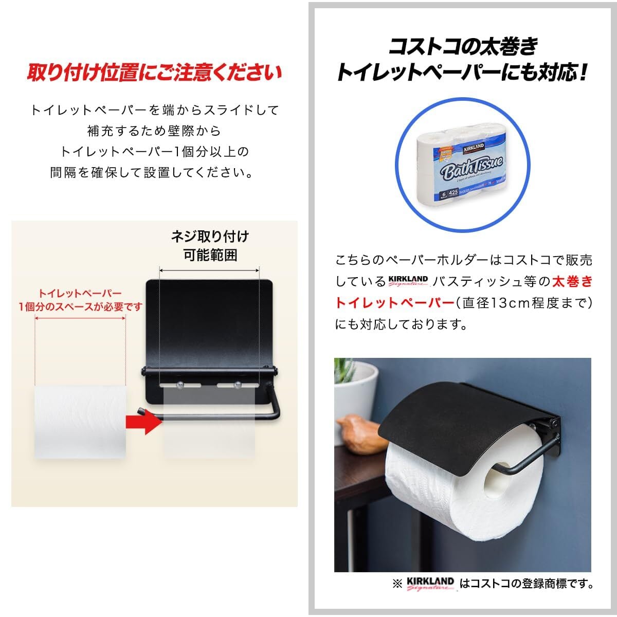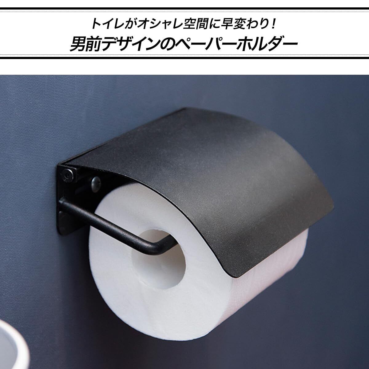 【トイレがオシャレ空間に早変わり!】 オールアイアン素材でシンプルながら 男前なデザインのペーパーホルダー。 ブラックカラーが空間を引き締め トイレの雰囲気をガラリと変えてくれます。 ※こちらのペーパーホルダーはコストコで販売しているKIRKLANDバスティッシュ等の太巻きトイレットペーパー(直径13㎝程度まで)にも対応しております。