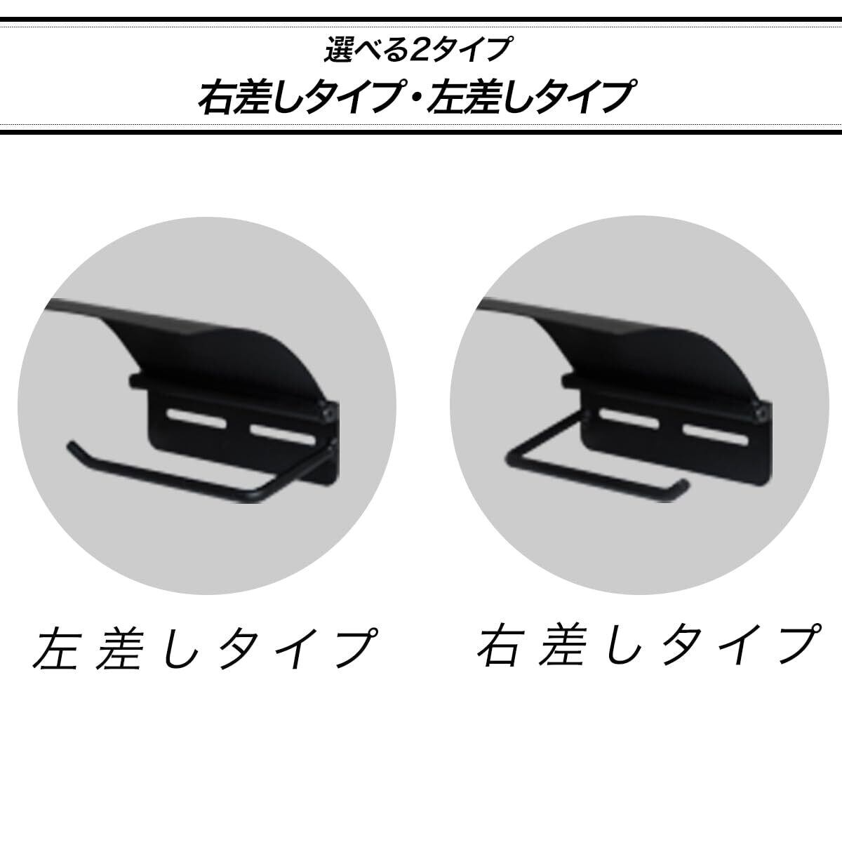 【賃貸でも安心】 新たに穴を開けずに設置可能 元々ついているペーパーホルダーを外して 同じ位置に取り付け可能です。 新たにネジ穴を付ける必要がないので 賃貸でも安心です。 【選べる2タイプ】 右差しタイプ・左差しタイプ 本製品は右差しと左差し2つのタイプをご用意しています。 設置したい場所に合わせて 使いやすい方をお選びいただけます。