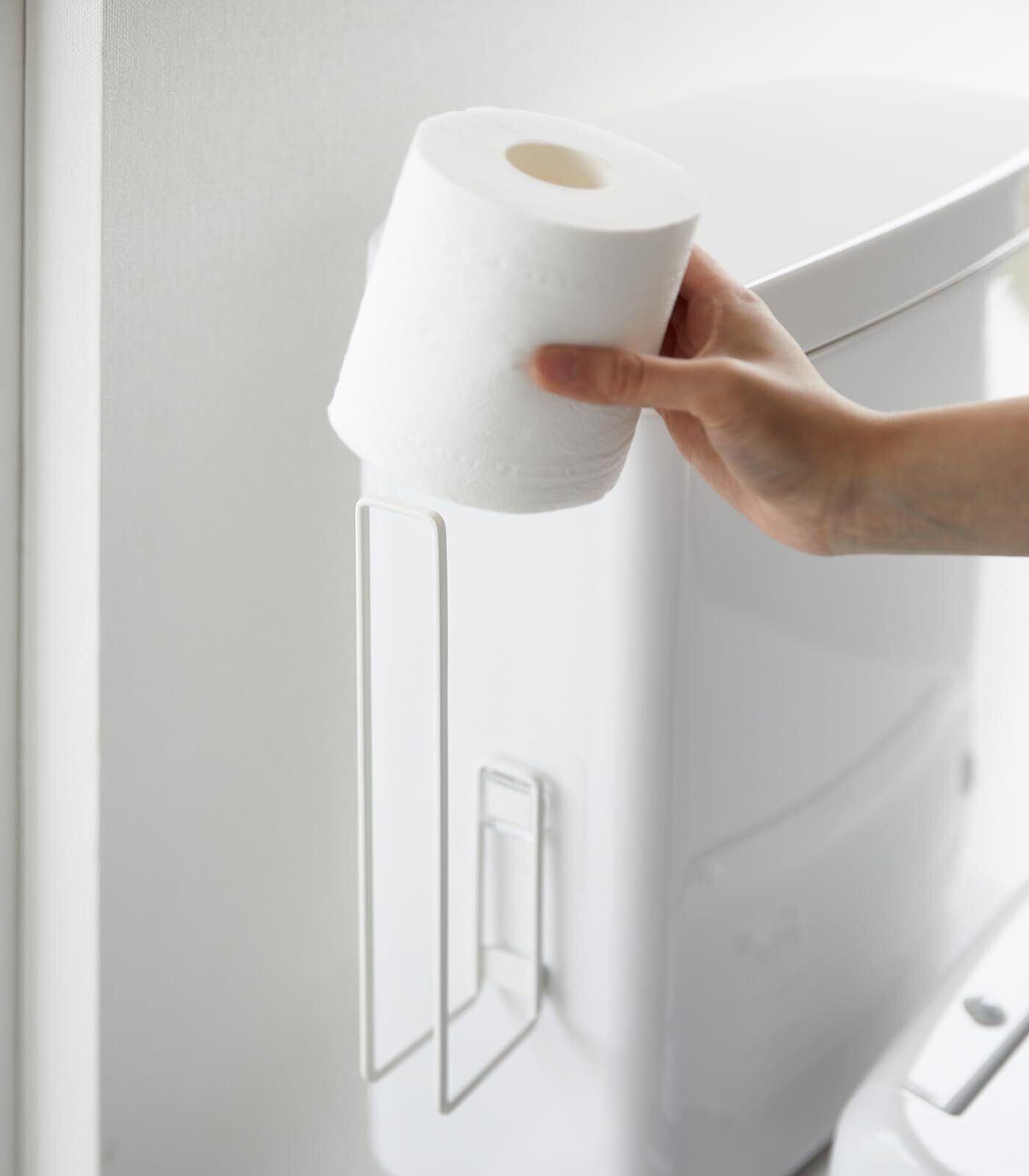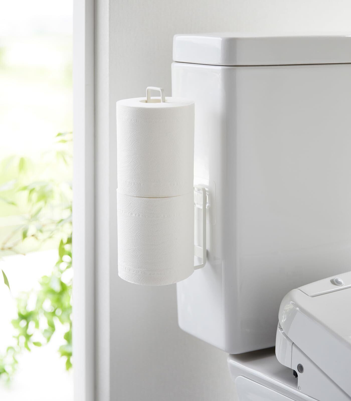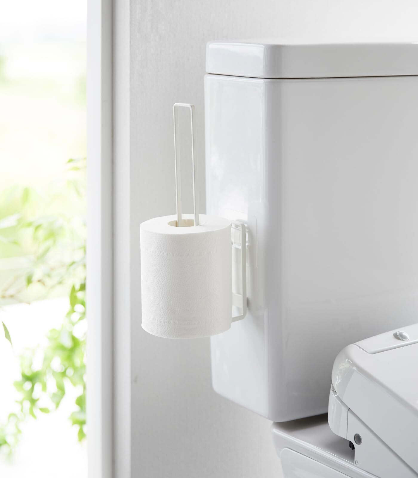 フィルムフックでトイレタンクやタイルに、浮かせて設置できるトイレットペーパーホルダー。