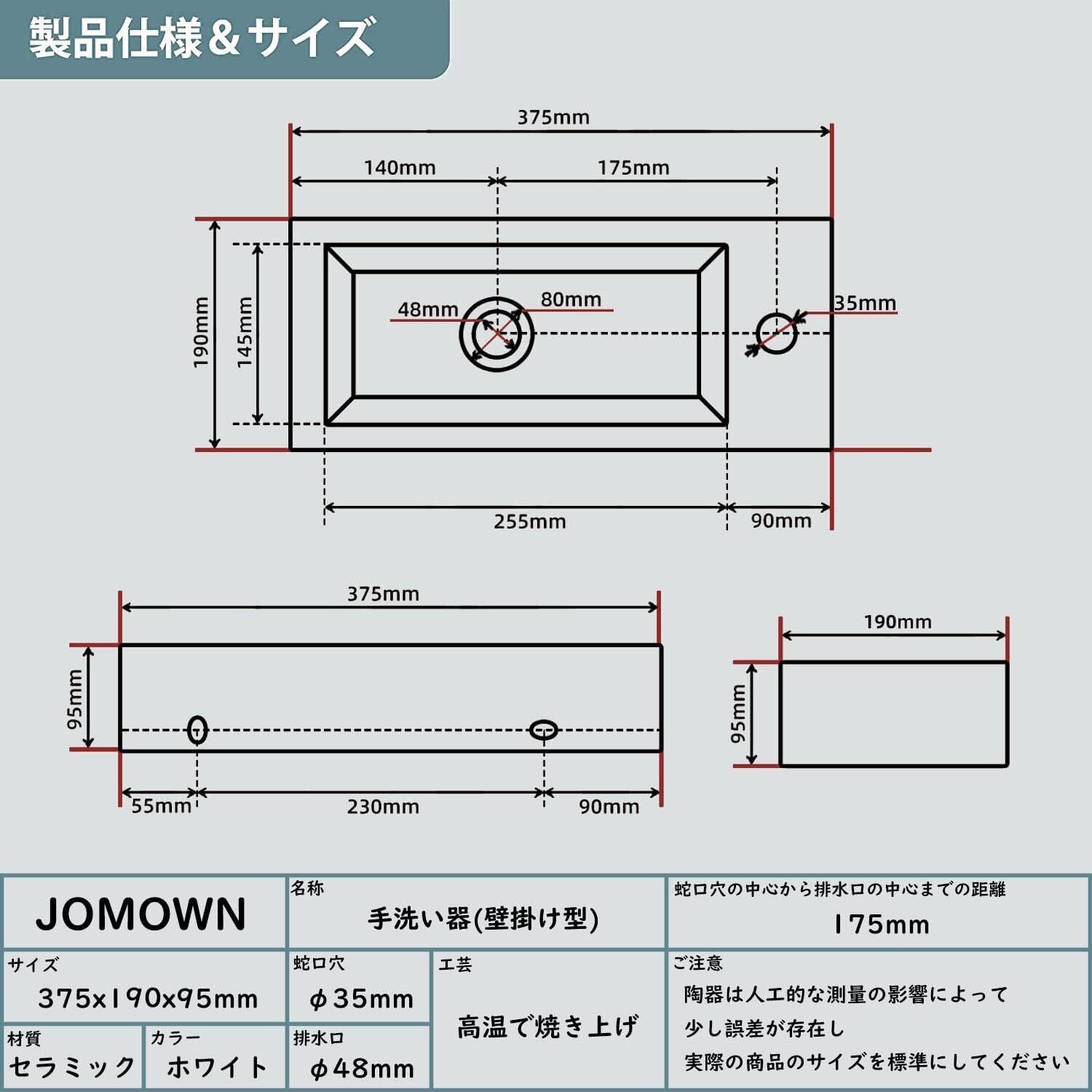 【規格&取り付け説明】:手洗い器サイズ:375*190*95mm、重さ:5.1kg、排水口径:48mm、蛇口の取り付け穴径:36mm。 形:長方形(右)、この手洗台は和洋問わず、オフィス、図書館、喫茶店、飲食店、ホテル、洗面所、お風呂場など様々な所に合います。すっきりとした印象の洗面スペースをお望みの場合におすすめです。手洗い鉢と排水金具は設置が簡単なので、取扱説明書どおりに設置すればでいいです。おしゃれなデザインを与えています。