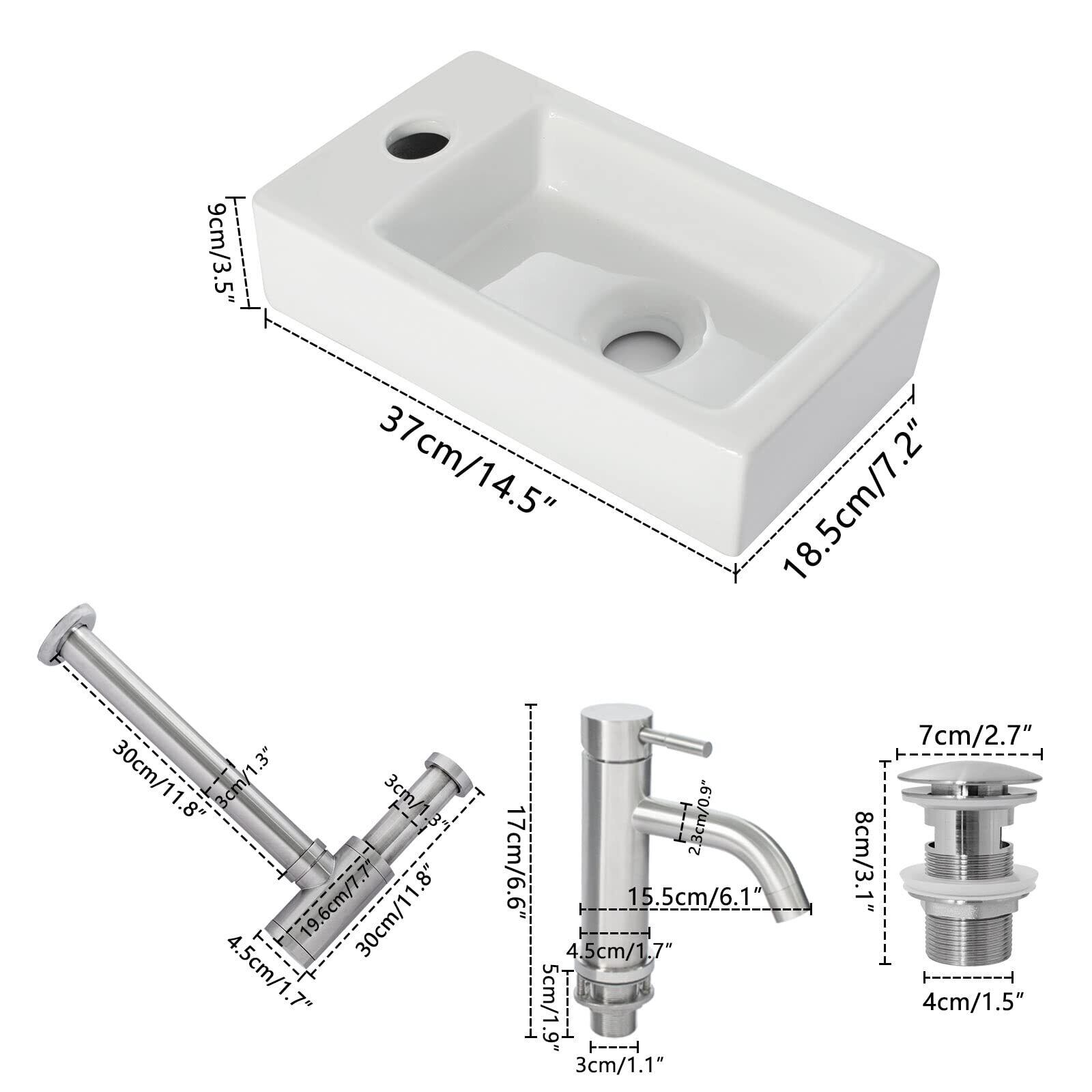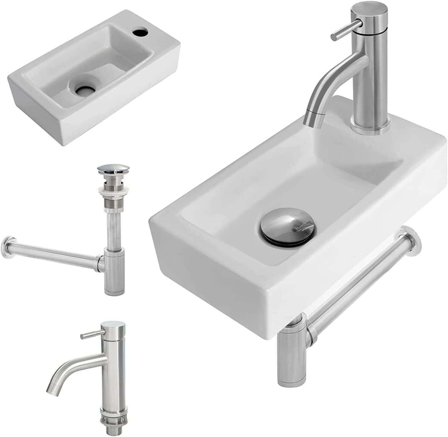 Rxakudedo 手洗い器 壁付け型 陶器製 小さなトイレに適し洗面器 蛇口 水栓&排水金具付き 和風 洋風 壁掛け おしゃれ シンプル 洗面台 キッチン用水栓 混合水栓 (右側洗面器+蛇口)