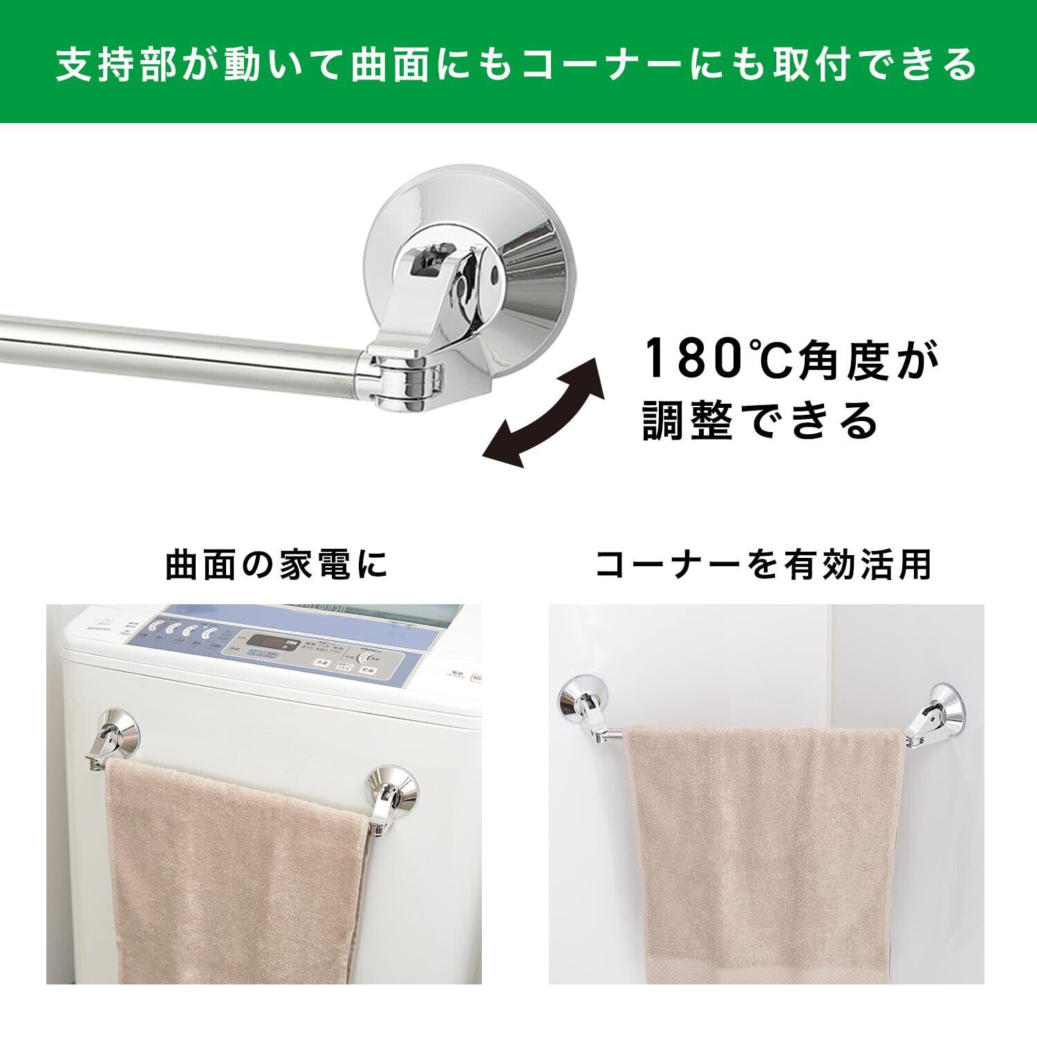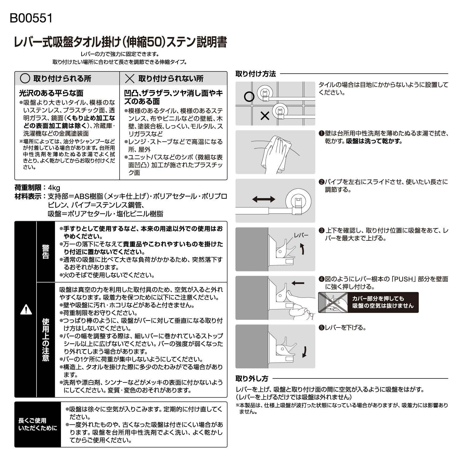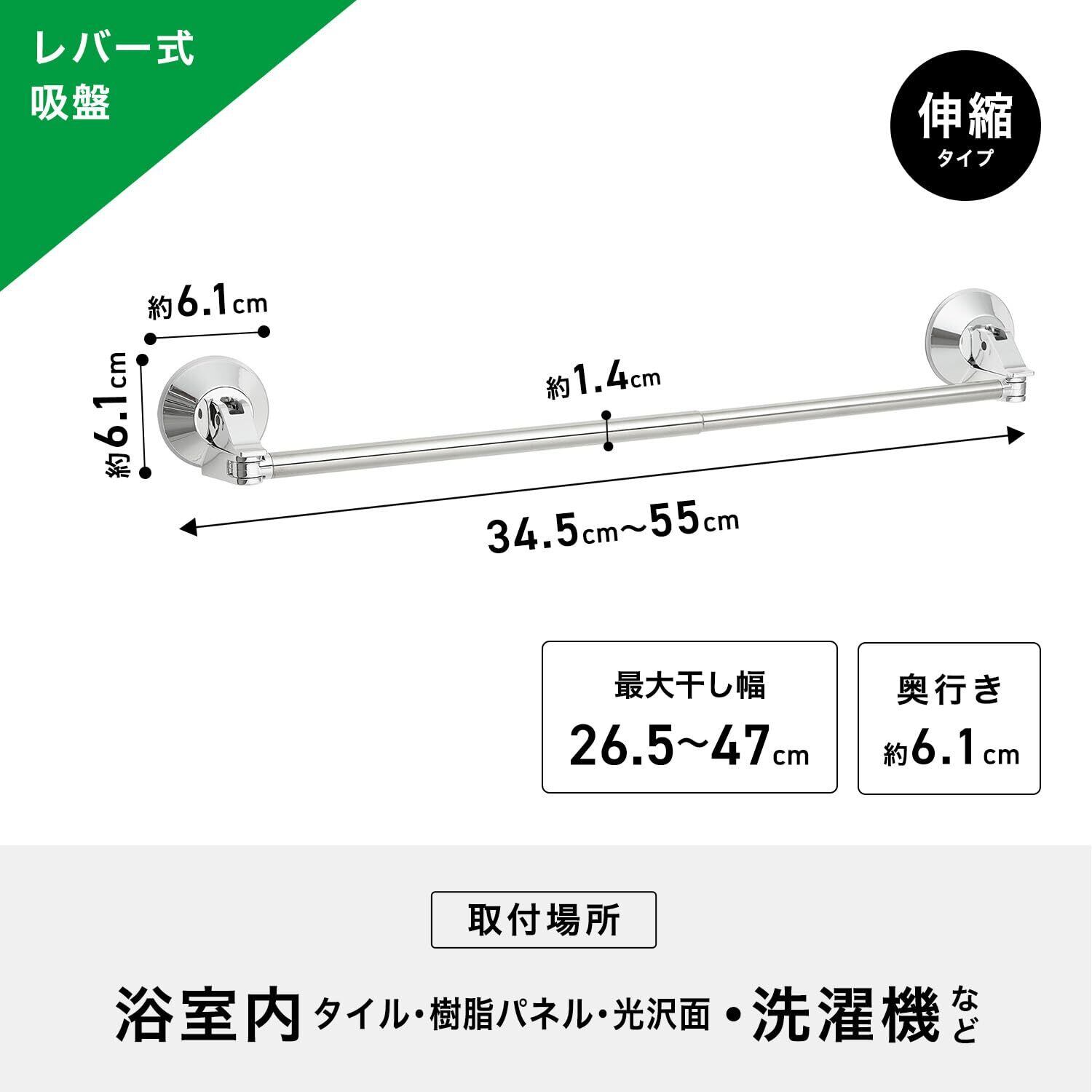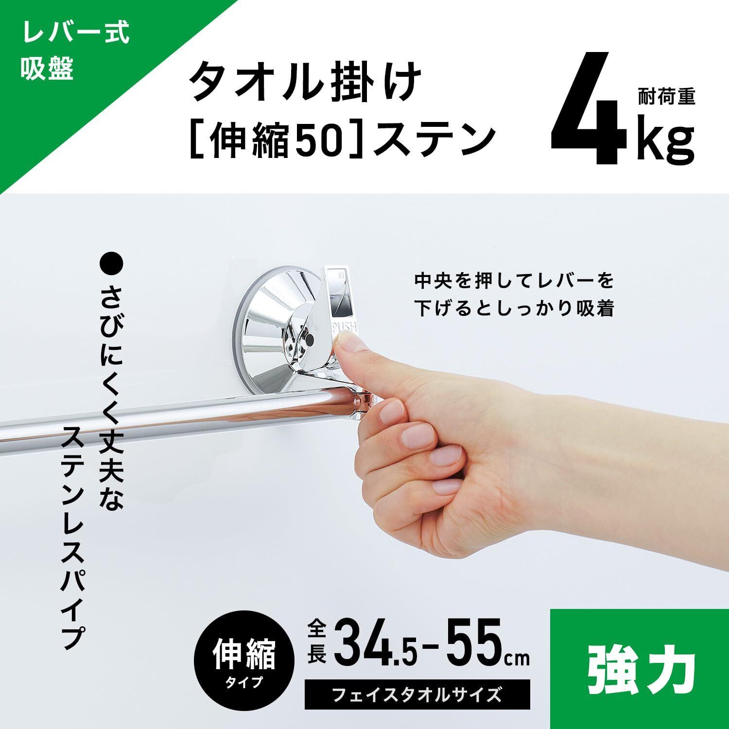 レバー式 強力 吸盤 伸縮 タオル掛け ステンレス 伸縮幅 34.5~55cm(干幅26.5~47cm) 耐荷重4kg フェイスタオルサイズ