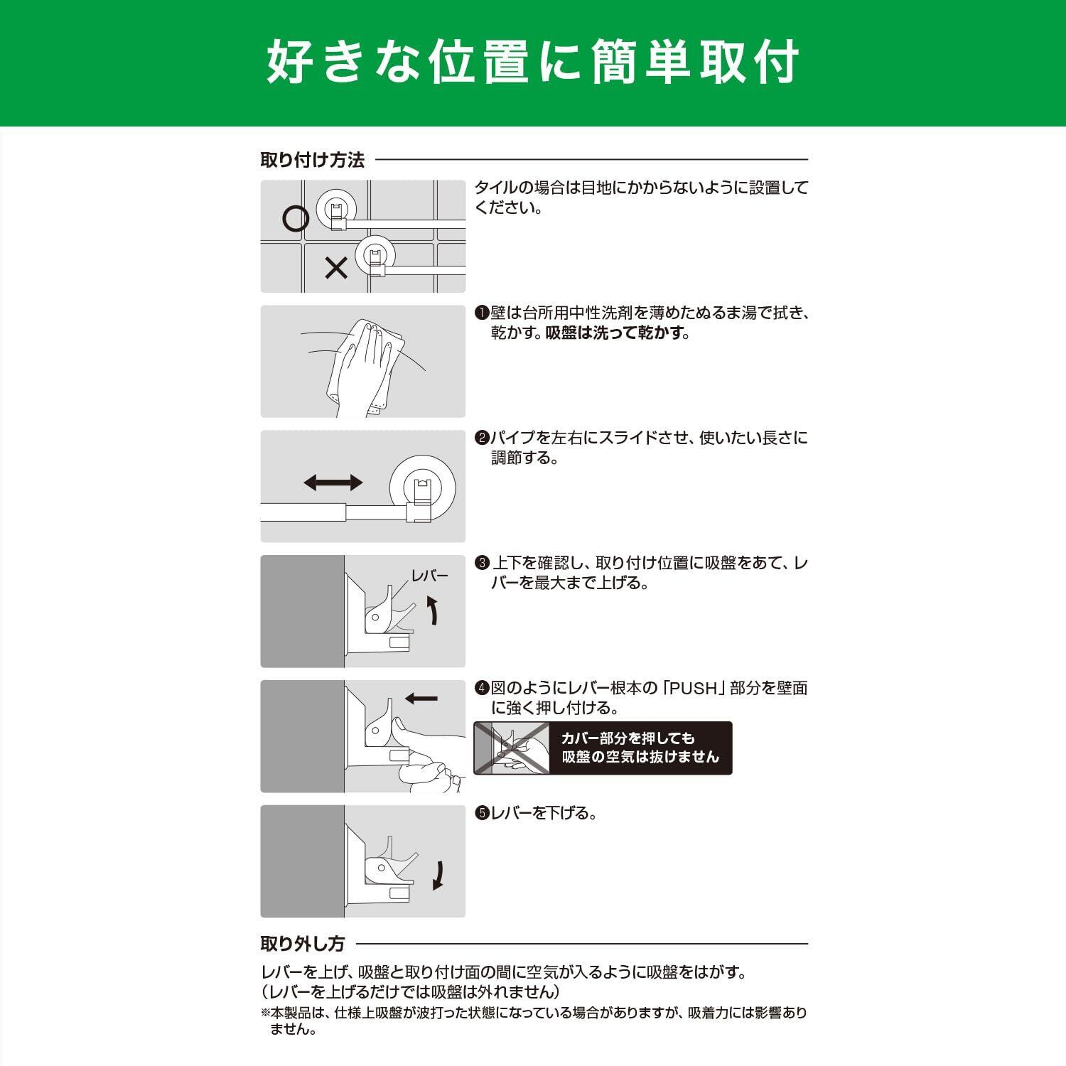 ・吸盤より大きいタイル、模様のないステンレス、プラスチック面、透明ガラス、鏡面(くもり止め加工などの表面加工鏡は除く)、冷蔵庫・洗濯機などの金属塗装面
