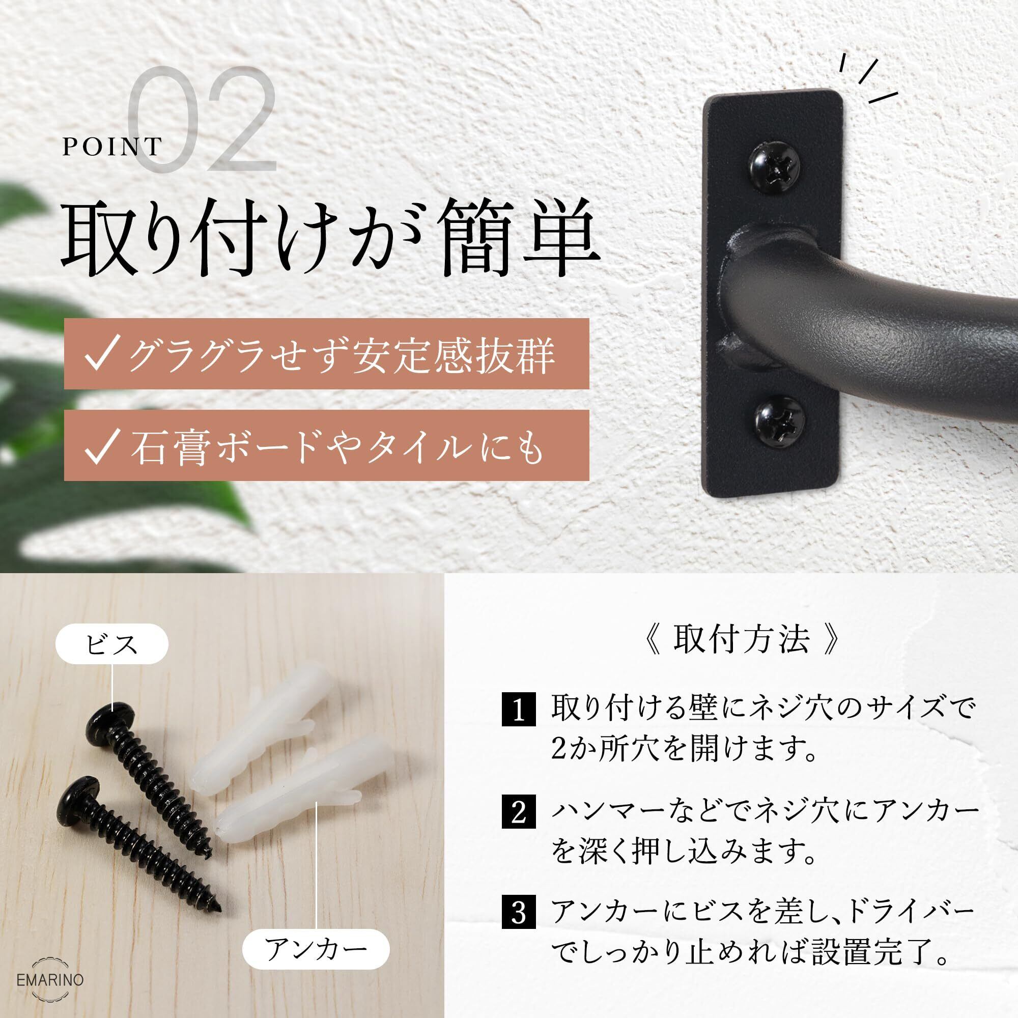 ◆片側のみの固定ですが、グラグラせず安定感抜群◎ビスだけでなく、専用のアンカーを使用ししっかり留めることで、強度が増し落下の心配がありません。石膏ボードやタイルなど、ネジ穴を開けることができる壁や家具に取り付けてお使いください。※耐荷重約2kg ※設置場所の壁の厚みにご注意ください
