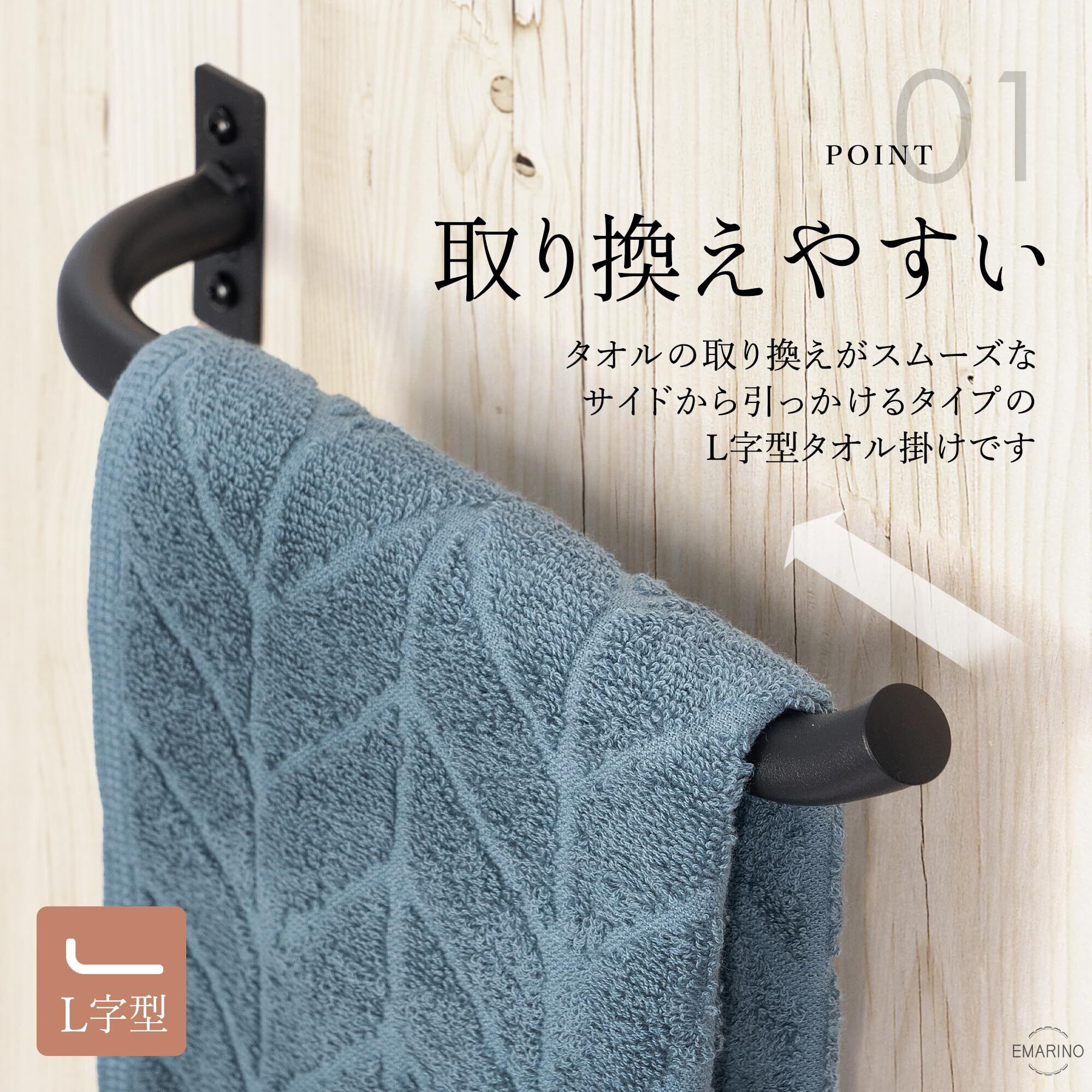 【タオルを取り換えやすい】デザイン性だけでなく、使いやすさにもこだわり設計されたL字型タイプは、両サイドを固定するタオル掛けと違い、サイドからサッと引っかけるだけのストレスフリー仕様がポイントです。