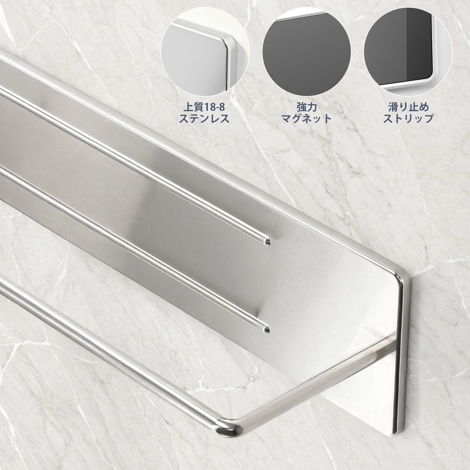 【強力マグネット】このバスルームタオルバーは組み立て不要、穴あけ不要。裏面全体に強力なマグネットを使用、磁石を設置できる面にしっかりと貼り付けることができ、背中の磁石の両側の滑り止めはさらに磁気吸引能力を倍増させ、使用時にずれにくいです。 また、壁を傷つけませんので、賃貸住宅にお住まいの方にとても適しています。