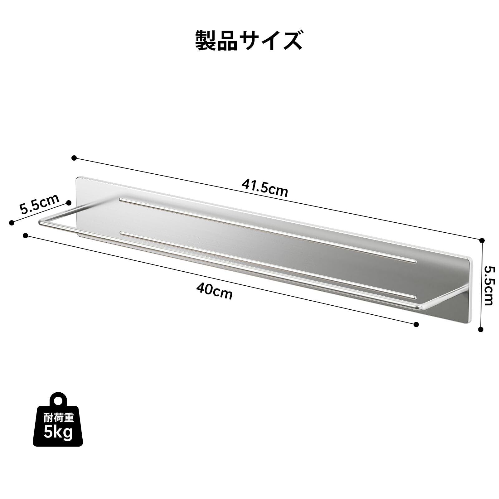 【広いサイズ】浴室用タオルかけ外寸長さ41.5cm、高さ5.5cm。内寸の長さ40cm、幅5.5cm、耐荷重は約5kgで、タオルも2枚は余裕でかけれます。タオル以外にも、お掃除スプレーボトル、バスマット、ハンガーなど、吊るして収納できるものにも使用できます。