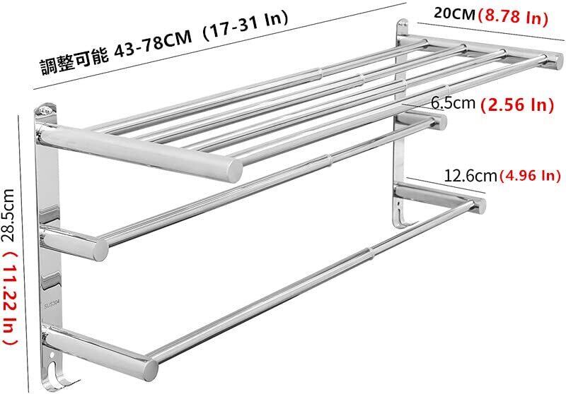 【ステンレス鋼素材】:ステンレス製、耐久性、実用性、長寿命。 【取り付けが簡単】:2つの取り付け方法があり、1つ目は穴をあけて、ネジで固定することができます。第2種は壁に穴をあけなくて、強力な3 Mで貼り付けて取り付けて、壁を保護します 【適用範囲】:ポーチ、リビング、バスルーム、キッチン、トイレ、オフィスなど,タオルやバスタオルなどを置くことができ、スペースを節約でき、より簡潔 【長さは自由に伸縮可能】:タオルフレームの伸縮長さは43~78 cmの範囲で、スペースの大きさに合わせて長さを調節して取り付けます 【サービスコンセプト】:カスタマーエクスペリエンスに注意を払います。最高のサービスを提供します。ご使用中にご不明な点がございましたら、お気軽にお問い合わせください。より良い製品を提供したいと考えています。