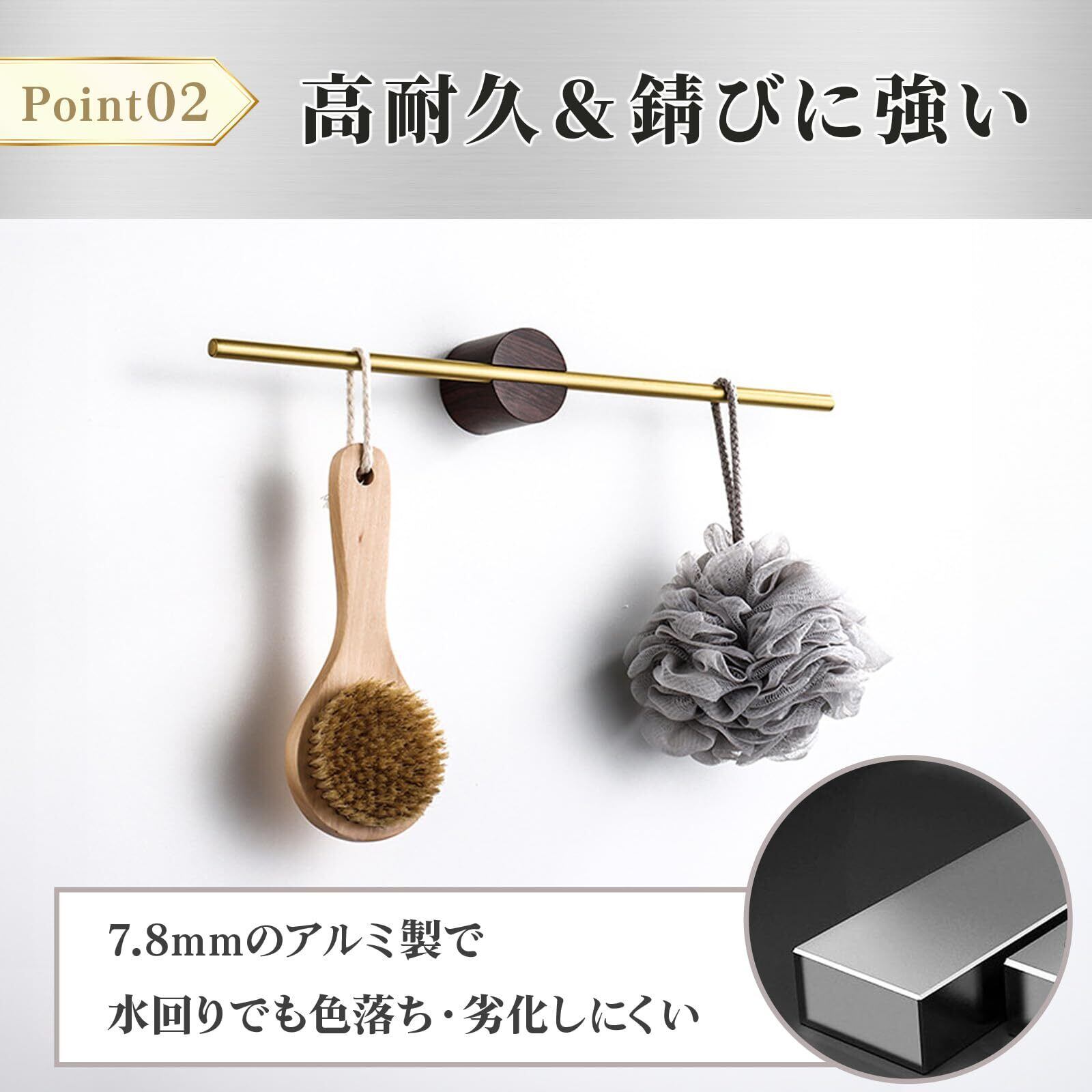 【高耐久アルミ合金製、長く美しく】7.8mmの極太アルミポールが実現する抜群の剛性と耐衝撃性。水回りでも錆びにくく、長期間使用しても色落ちや劣化の心配がありません。ホテルやオフィスなどプロユースにも対応する品質で、家庭でもワンランク上の空間作りが可能。耐久性だけでなく、スタイリッシュな外観がインテリアにも馴染みます。タオルやローブ、衣類、掃除用品など幅広い用途に対応します。