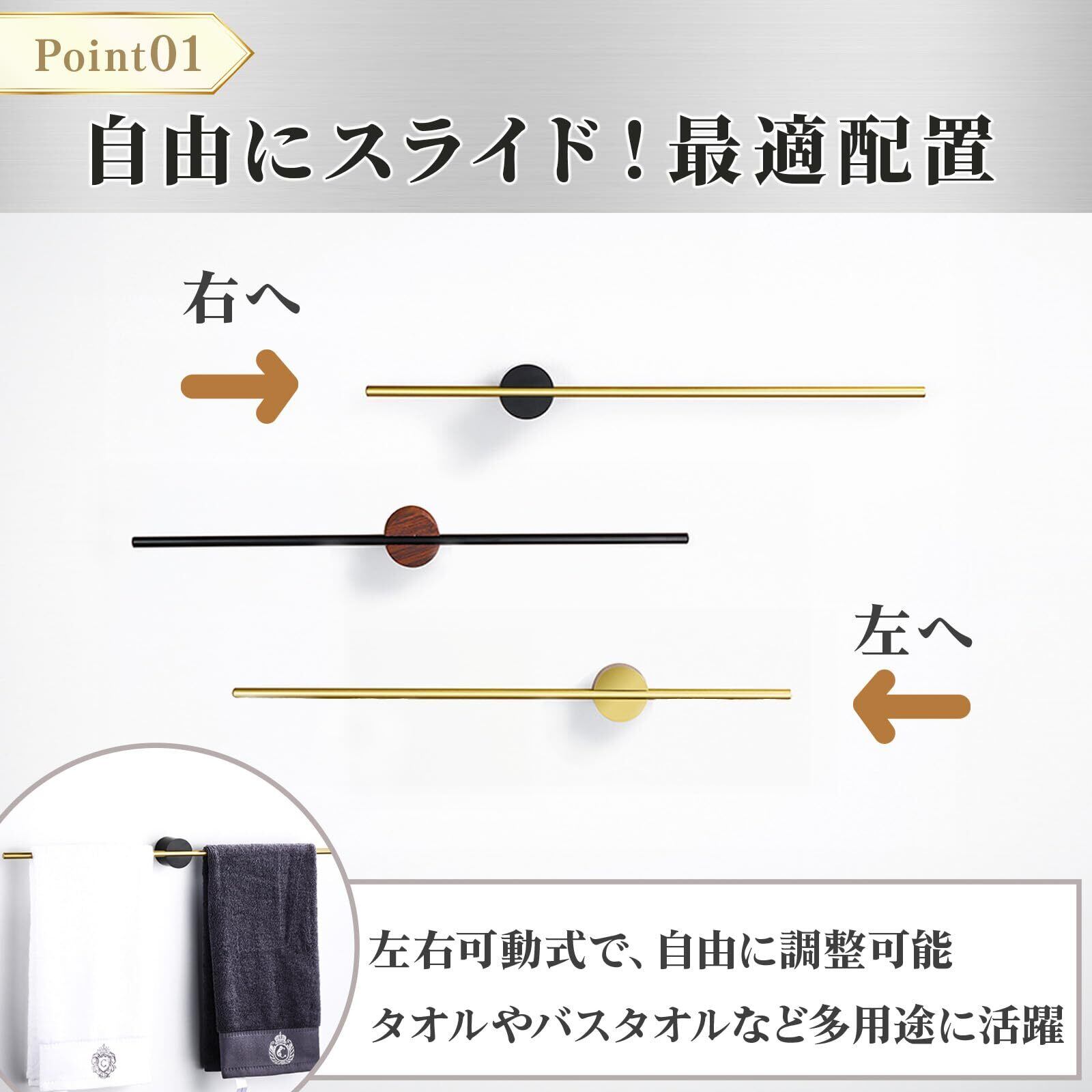 【用途自在、家中どこでも活躍】タオルバーとしてだけでなく、玄関でコートやバッグを掛けたり、キッチンでエコバッグやふきんを収納したりと、多用途に活用できる万能デザイン。シンプルかつモダンなルックスは、どんなインテリアにも自然に馴染み、空間をセンス良くまとめます。スライド式の支持部でサイズ調整も自由自在。限られたスペースでも収納力を高め、暮らしをすっきり快適にサポートする心強いおしゃれアイテムです。
